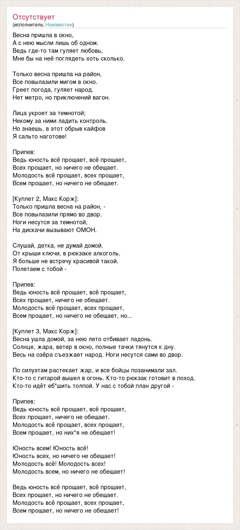 Весна пришла в окно, А с нею мысли лишь об одном. Ведь где-то там гуляет любовь, Мне бы на неё поглядеть хоть сколько. Только весна пришла на район, Все повылазили мигом в окно. Греет погода, гуляет народ. Нет метро, но приключений вагон. Лица укроет за темнотой; Некому за ними ладить контроль. Но знаешь, в этот обрыв кайфов Я сальто наготове! Припев: Ведь юность всё прощает, всё прощает, Всех прощает, но ничего не обещает. Молодость всё прощает, всех прощает, Всем прощает, но ничего не обещает. [Куплет 2, Макс Корж]: Только пришла весна на район, - Все повылазили прямо во двор. Ноги несутся за темнотой, На дискачи вызывают ОМОН. Слушай, детка, не думай домой. От крыши ключи, в рюкзаке алкоголь. Я больше не встречу красивой такой. Полетаем с тобой - Припев: Ведь юность всё прощает, всё прощает, Всех прощает, ничего не обещает. Молодость всё прощает, всех прощает, Всем прощает, но ничего не обещает, но... [Куплет 3, Макс Корж]: Весна ушла домой, за нею лето отбивает ладонь. Солнце, жара, ветер в окно, полные тачки тянутся к дну. Весь на озёра съезжает народ. Ноги несутся сами во двор. По силуэтам растекает жар, и все бойцы позанимали зал. Кто-то с гитарой вышел в огонь. Кто-то рюкзак готовит в поход. Кто-то идёт еб*шить толпой. У нас с тобой план другой - Припев: Ведь юность всё прощает, всё прощает, Всех прощает, ничего не обещает. Молодость всё прощает, всех прощает, Всем прощает, но них*я не обещает! Юность всем! Юность всё! Юность всех, но ничего не обещает! Молодость всё! Молодость всех! Молодость всем, но ничего не обещает! Ведь юность всё прощает, всё прощает, Всех прощает, но ничего не обещает. Молодость всё прощает, всех прощает, Всем прощает, но ничего не обещает!