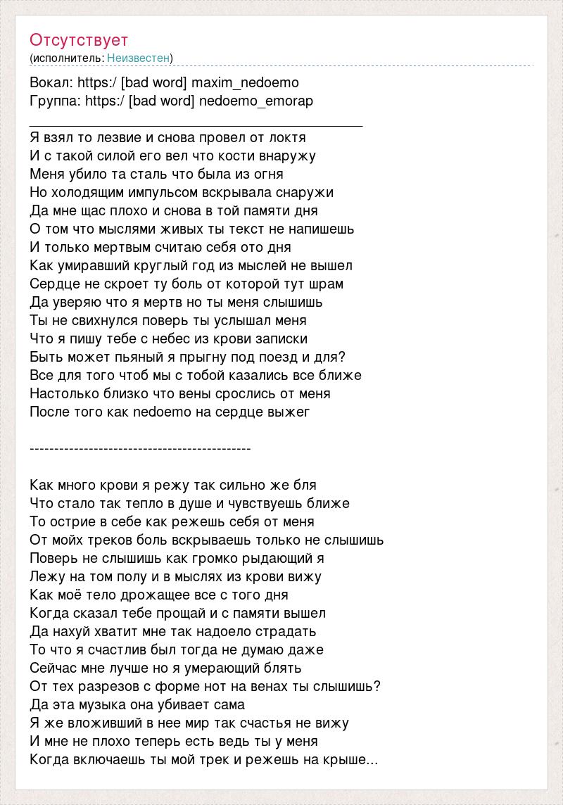 Вокал: https:/ [bad word] maxim_nedoemo Группа: https:/ [bad word] nedoemo_emorap ___________________________________________ Я взял то лезвие и снова провел от локтя И с такой силой его вел что кости внаружу Меня убило та сталь что была из огня Но холодящим импульсом вскрывала снаружи Да мне щас плохо и снова в той памяти дня О том что мыслями живых ты текст не напишешь И только мертвым считаю себя ото дня Как умиравший круглый год из мыслей не вышел Сердце не скроет ту боль от которой тут шрам Да уверяю что я мертв но ты меня слышишь Ты не свихнулся поверь ты услышал меня Что я пишу тебе с небес из крови записки Быть может пьяный я прыгну под поезд и для? Все для того чтоб мы с тобой казались все ближе Настолько близко что вены срослись от меня После того как nedoemo на сердце выжег --------------------------------------------- Как много крови я режу так сильно же бля Что стало так тепло в душе и чувствуешь ближе То острие в себе как режешь себя от меня От мойх треков боль вскрываешь только не слышишь Поверь не слышишь как громко рыдающий я Лежу на том полу и в мыслях из крови вижу Как моё тело дрожащее все с того дня Когда сказал тебе прощай и с памяти вышел Да нахуй хватит мне так надоело страдать То что я счастлив был тогда не думаю даже Сейчас мне лучше но я умерающий блять От тех разрезов с форме нот на венах ты слышишь? Да эта музыка она убивает сама Я же вложивший в нее мир так счастья не вижу И мне не плохо теперь есть ведь ты у меня Когда включаешь ты мой трек и режешь на крыше...