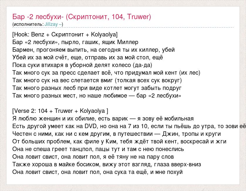 [Hook: Benz + Скриптонит + Kolyaolya] Бар «2 лесбухи», пырло, гашик, ящик Миллер Бармен, прогоняем выпить, на сегодня ты их киллер, убей Убей их за мой счёт, еще, отправь их за мой стол, ещё Пока суки втихаря в уборной делят колесо (да-да) Так много сук за пресс сделает всё, что придумал мой кент (их лес) Так много сук на вес слетается вмиг (толкая всех сук вокруг) Так много разных лесб при виде котлет могут забыть подруг Так много разных мест, но наше любимое — бар «2 лесбухи» [Verse 2: 104 + Truwer + Kolyaolya ] Я люблю женщин и их обилие, есть варик — я зову её мобильная Есть другой умеет как на DVD, но она на 7 из 10, если ты пьёшь до утра, то зови её Честен с ними, как ни с кем другим, в путешествии — Джин, тропы и круги От больших проблем, как филе у Ким, тебя ждёт твой кент, воскресай и жги Она не спеша греет танцпол, пацы тут и там с нею понеслись Она ловит свист, она ловит пол, я её тяну не на пару слов Также хороша в майке босиком, вижу этот взгляд, глаза вверх-вниз Она ловит свист, она ловит пол, она сука та ещё, и мне похуй