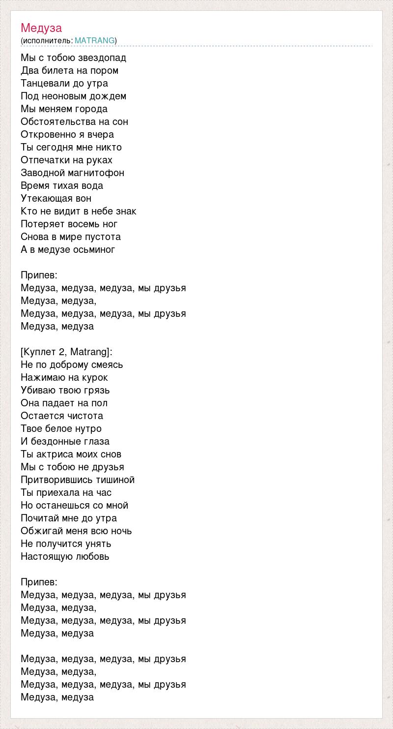 Мы с тобою звездопад Два билета на пором Танцевали до утра Под неоновым дождем Мы меняем города Обстоятельства на сон Откровенно я вчера Ты сегодня мне никто Отпечатки на руках Заводной магнитофон Время тихая вода Утекающая вон Кто не видит в небе знак Потеряет восемь ног Снова в мире пустота А в медузе осьминог Припев: Медуза, медуза, медуза, мы друзья Медуза, медуза, Медуза, медуза, медуза, мы друзья Медуза, медуза [Куплет 2, Matrang]: Не по доброму смеясь Нажимаю на курок Убиваю твою грязь Она падает на пол Остается чистота Твое белое нутро И бездонные глаза Ты актриса моих снов Мы с тобою не друзья Притворившись тишиной Ты приехала на час Но останешься со мной Почитай мне до утра Обжигай меня всю ночь Не получится унять Настоящую любовь Припев: Медуза, медуза, медуза, мы друзья Медуза, медуза, Медуза, медуза, медуза, мы друзья Медуза, медуза Медуза, медуза, медуза, мы друзья Медуза, медуза, Медуза, медуза, медуза, мы друзья Медуза, медуза
