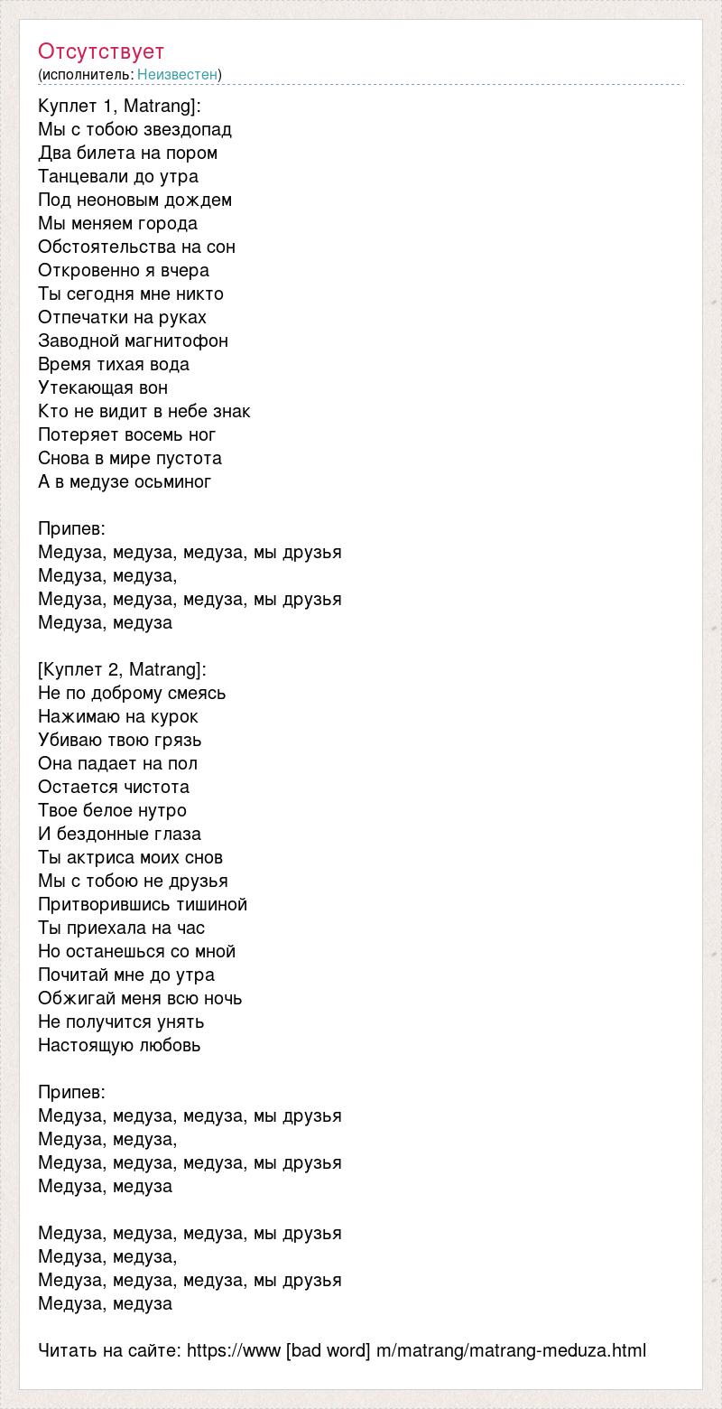 Куплет 1, Matrang]: Мы с тобою звездопад Два билета на пором Танцевали до утра Под неоновым дождем Мы меняем города Обстоятельства на сон Откровенно я вчера Ты сегодня мне никто Отпечатки на руках Заводной магнитофон Время тихая вода Утекающая вон Кто не видит в небе знак Потеряет восемь ног Снова в мире пустота А в медузе осьминог Припев: Медуза, медуза, медуза, мы друзья Медуза, медуза, Медуза, медуза, медуза, мы друзья Медуза, медуза [Куплет 2, Matrang]: Не по доброму смеясь Нажимаю на курок Убиваю твою грязь Она падает на пол Остается чистота Твое белое нутро И бездонные глаза Ты актриса моих снов Мы с тобою не друзья Притворившись тишиной Ты приехала на час Но останешься со мной Почитай мне до утра Обжигай меня всю ночь Не получится унять Настоящую любовь Припев: Медуза, медуза, медуза, мы друзья Медуза, медуза, Медуза, медуза, медуза, мы друзья Медуза, медуза Медуза, медуза, медуза, мы друзья Медуза, медуза, Медуза, медуза, медуза, мы друзья Медуза, медуза Читать на сайте: https://www [bad word] m/matrang/matrang-meduza.html