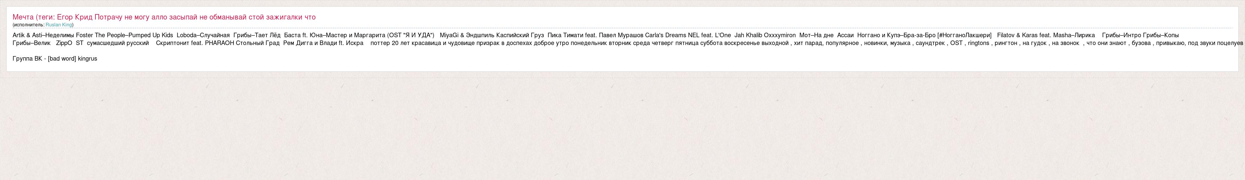 Artik & Asti–Неделимы Foster The People–Pumped Up Kids Loboda–Случайная Грибы–Тает Лёд Баста ft. Юна–Мастер и Маргарита (OST "Я И УДА") MiyaGi & Эндшпиль Каспийский Груз Пика Тимати feat. Павел Мурашов Carla's Dreams NEL feat. L'Оne Jah Khalib Oxxxymiron Мот–На дне Ассаи Ноггано и Купэ–Бра-за-Бро [#НогганоЛакшери] Filatov & Karas feat. Masha–Лирика Грибы–Интро Грибы–Копы Грибы–Велик ZippO ST сумасшедший русский Скриптонит feat. PHARAOH Стольный Град Рем Дигга и Влади ft. Искра поттер 20 лет красавица и чудовище призрак в доспехах доброе утро понедельник вторник среда четверг пятница суббота воскресенье выходной , хит парад, популярное , новинки, музыка , саундтрек , OST , ringtons , рингтон , на гудок , на звонок , что они знают , бузова , привыкаю, под звуки поцелуев Группа ВК - [bad word] kingrus