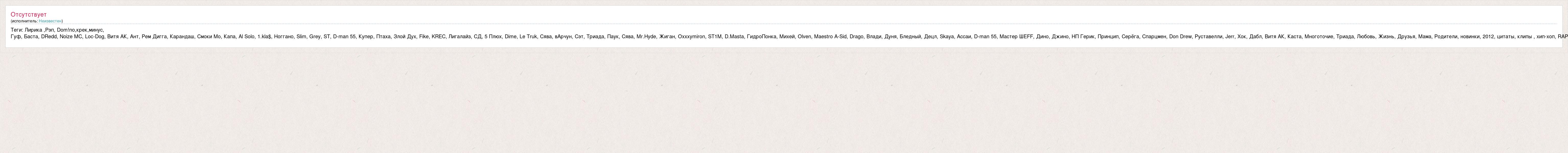 Теги: Лирика ,Рэп, Dom!no,крек,минус, Гуф, Баста, DRedd, Noize MC, Loc-Dog, Витя АК, Ант, Рем Дигга, Карандаш, Смоки Мо, Капа, Al Solo, 1.kla$, Ноггано, Slim, Grey, ST, D-man 55, Купер, Птаха, Злой Дух, Fike, KREC, Лигалайз, СД, 5 Плюх, Dime, Le Truk, Сява, вАрчун, Сэт, Триада, Паук, Сява, Mr.Hyde, Жиган, Oxxxymiron, ST1M, D.Masta, ГидроПонка, Михей, Olven, Maestro A-Sid, Drago, Влади, Дуня, Бледный, Децл, Skaya, Ассаи, D-man 55, Мастер ШEFF, Дино, Джино, НП Герик, Принцип, Серёга, Спарцмен, Don Drew, Руставелли, Jerr, Хок, Дабл, Витя АК, Каста, Многоточие, Триада, Любовь, Жизнь, Друзья, Мама, Родители, новинки, 2012, цитаты, клипы , хип-хоп, RAP