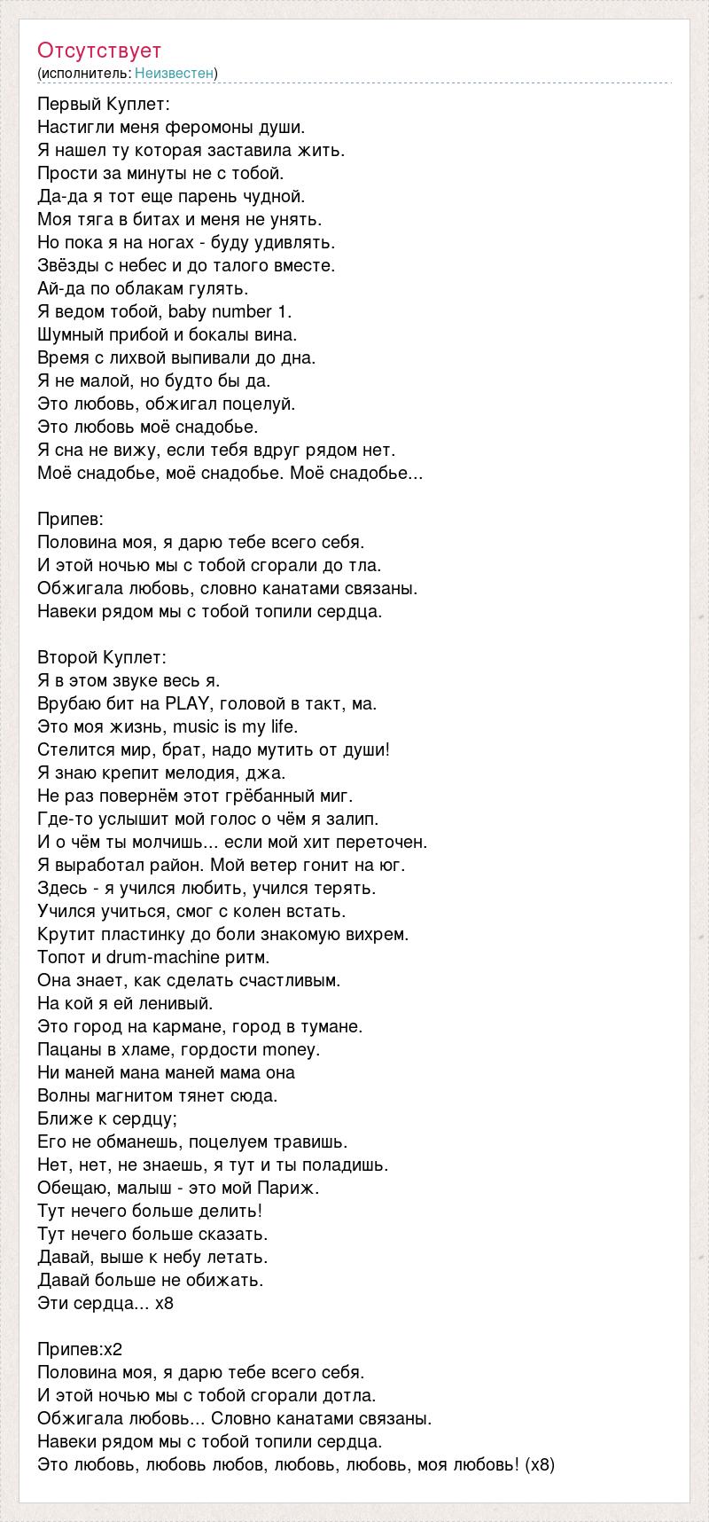 Первый Куплет: Настигли меня феромоны души. Я нашел ту которая заставила жить. Прости за минуты не с тобой. Да-да я тот еще парень чудной. Моя тяга в битах и меня не унять. Но пока я на ногах - буду удивлять. Звёзды с небес и до талого вместе. Ай-да по облакам гулять. Я ведом тобой, baby number 1. Шумный прибой и бокалы вина. Время с лихвой выпивали до дна. Я не малой, но будто бы да. Это любовь, обжигал поцелуй. Это любовь моё снадобье. Я сна не вижу, если тебя вдруг рядом нет. Моё снадобье, моё снадобье. Моё снадобье... Припев: Половина моя, я дарю тебе всего себя. И этой ночью мы с тобой сгорали до тла. Обжигала любовь, словно канатами связаны. Навеки рядом мы с тобой топили сердца. Второй Куплет: Я в этом звуке весь я. Врубаю бит на PLAY, головой в такт, ма. Это моя жизнь, music is my life. Стелится мир, брат, надо мутить от души! Я знаю крепит мелодия, джа. Не раз повернём этот грёбанный миг. Где-то услышит мой голос о чём я залип. И о чём ты молчишь... если мой хит переточен. Я выработал район. Мой ветер гонит на юг. Здесь - я учился любить, учился терять. Учился учиться, смог с колен встать. Крутит пластинку до боли знакомую вихрем. Топот и drum-machine ритм. Она знает, как сделать счастливым. На кой я ей ленивый. Это город на кармане, город в тумане. Пацаны в хламе, гордости money. Ни маней мана маней мама она Волны магнитом тянет сюда. Ближе к сердцу; Его не обманешь, поцелуем травишь. Нет, нет, не знаешь, я тут и ты поладишь. Обещаю, малыш - это мой Париж. Тут нечего больше делить! Тут нечего больше сказать. Давай, выше к небу летать. Давай больше не обижать. Эти сердца... x8 Припев:x2 Половина моя, я дарю тебе всего себя. И этой ночью мы с тобой сгорали дотла. Обжигала любовь... Словно канатами связаны. Навеки рядом мы с тобой топили сердца. Это любовь, любовь любов, любовь, любовь, моя любовь! (х8)