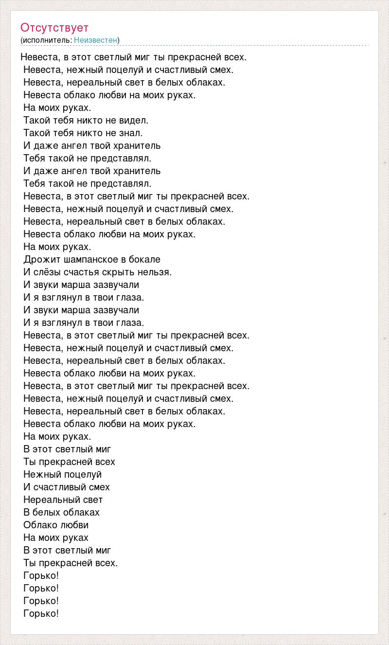 Невеста, в этот светлый миг ты прекрасней всех. Невеста, нежный поцелуй и счастливый смех. Невеста, нереальный свет в белых облаках. Невеста облако любви на моих руках. На моих руках. Такой тебя никто не видел. Такой тебя никто не знал. И даже ангел твой хранитель Тебя такой не представлял. И даже ангел твой хранитель Тебя такой не представлял. Невеста, в этот светлый миг ты прекрасней всех. Невеста, нежный поцелуй и счастливый смех. Невеста, нереальный свет в белых облаках. Невеста облако любви на моих руках. На моих руках. Дрожит шампанское в бокале И слёзы счастья скрыть нельзя. И звуки марша зазвучали И я взглянул в твои глаза. И звуки марша зазвучали И я взглянул в твои глаза. Невеста, в этот светлый миг ты прекрасней всех. Невеста, нежный поцелуй и счастливый смех. Невеста, нереальный свет в белых облаках. Невеста облако любви на моих руках. Невеста, в этот светлый миг ты прекрасней всех. Невеста, нежный поцелуй и счастливый смех. Невеста, нереальный свет в белых облаках. Невеста облако любви на моих руках. На моих руках. В этот светлый миг Ты прекрасней всех Нежный поцелуй И счастливый смех Нереальный свет В белых облаках Облако любви На моих руках В этот светлый миг Ты прекрасней всех. Горько! Горько! Горько! Горько!