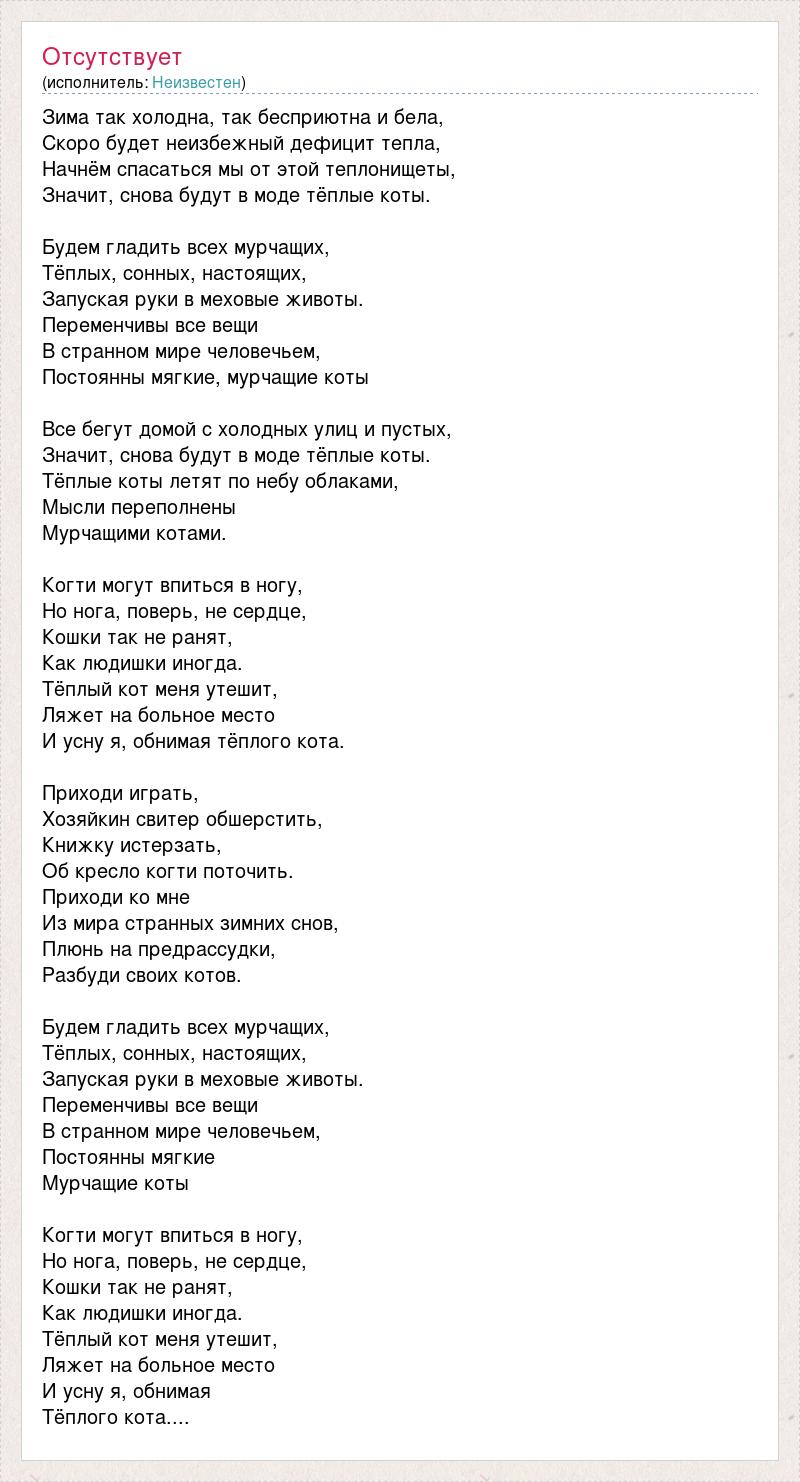 Зима так холодна, так бесприютна и бела, Скоро будет неизбежный дефицит тепла, Начнём спасаться мы от этой теплонищеты, Значит, снова будут в моде тёплые коты. Будем гладить всех мурчащих, Тёплых, сонных, настоящих, Запуская руки в меховые животы. Переменчивы все вещи В странном мире человечьем, Постоянны мягкие, мурчащие коты Все бегут домой с холодных улиц и пустых, Значит, снова будут в моде тёплые коты. Тёплые коты летят по небу облаками, Мысли переполнены Мурчащими котами. Когти могут впиться в ногу, Но нога, поверь, не сердце, Кошки так не ранят, Как людишки иногда. Тёплый кот меня утешит, Ляжет на больное место И усну я, обнимая тёплого кота. Приходи играть, Хозяйкин свитер обшерстить, Книжку истерзать, Об кресло когти поточить. Приходи ко мне Из мира странных зимних снов, Плюнь на предрассудки, Разбуди своих котов. Будем гладить всех мурчащих, Тёплых, сонных, настоящих, Запуская руки в меховые животы. Переменчивы все вещи В странном мире человечьем, Постоянны мягкие Мурчащие коты Когти могут впиться в ногу, Но нога, поверь, не сердце, Кошки так не ранят, Как людишки иногда. Тёплый кот меня утешит, Ляжет на больное место И усну я, обнимая Тёплого кота....