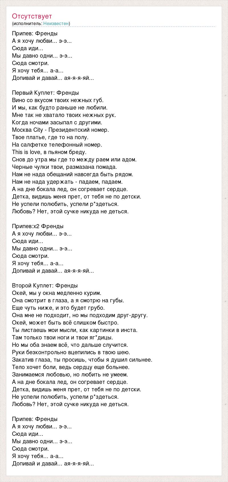 Припев: Френды А я хочу любви... э-э... Сюда иди... Мы давно одни... э-э... Сюда смотри. Я хочу тебя... а-а... Допивай и давай... ая-я-я-яй... Первый Куплет: Френды Вино со вкусом твоих нежных губ. И мы, как будто раньше не любили. Мне так не хватало твоих нежных рук. Когда ночами засыпал с другими. Москва City - Президентский номер. Твое платье, где то на полу. На салфетке телефонный номер. This is love, в пьяном бреду. Снов до утра мы где то между раем или адом. Черные чулки твои, размазана помада. Нам не нада обещаний навсегда быть рядом. Нам не нада удержать - падаем, падаем. А на дне бокала лед, он согревает сердце. Детка, видишь меня прет, от тебя не по детски. Не успели полюбить, успели р*здеться. Любовь? Нет, этой сучке никуда не деться. Припев:х2 Френды А я хочу любви... э-э... Сюда иди... Мы давно одни... э-э... Сюда смотри. Я хочу тебя... а-а... Допивай и давай... ая-я-я-яй... Второй Куплет: Френды Окей, мы у окна медленно курим. Она смотрит в глаза, а я смотрю на губы. Еще чуть ниже, и это будет грубо. Она мне не подходит, но мы подходим друг-другу. Окей, может быть всё слишком быстро. Ты листаешь мои мысли, как картинки в инста. Там только твои ноги и твои яг*дицы. Но мы оба знаем всё, что дальше случится. Руки безконтрольно вцепились в твою шею. Закатив глаза, ты просишь, чтобы я душил сильнее. Тело хочет боли, ведь сердцу еще больнее. Занимаемся любовью, но любить не умеем. А на дне бокала лед, он согревает сердце. Детка, видишь меня прет, от тебя не по детски. Не успели полюбить, успели р*здеться. Любовь? Нет, этой сучке никуда не деться. Припев: Френды А я хочу любви... э-э... Сюда иди... Мы давно одни... э-э... Сюда смотри. Я хочу тебя... а-а... Допивай и давай... ая-я-я-яй...