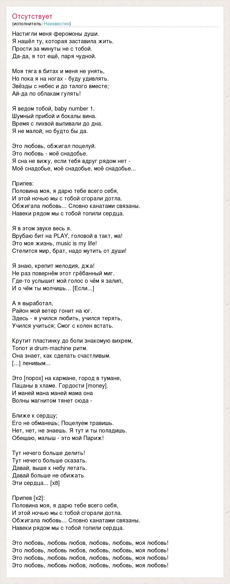 Настигли меня феромоны души. Я нашёл ту, которая заставила жить. Прости за минуты не с тобой. Да-да, я тот ещё, паря чудной. Моя тяга в битах и меня не унять, Но пока я на ногах - буду удивлять. Звёзды с небес и до талого вместе; Ай-да по облакам гулять! Я ведом тобой, baby number 1. Шумный прибой и бокалы вина. Время с лихвой выпивали до дна. Я не малой, но будто бы да. Это любовь, обжигал поцелуй. Это любовь - моё снадобье. Я сна не вижу, если тебя вдруг рядом нет - Моё снадобье, моё снадобье, моё снадобье... Припев: Половина моя, я дарю тебе всего себя, И этой ночью мы с тобой сгорали дотла. Обжигала любовь... Словно канатами связаны. Навеки рядом мы с тобой топили сердца. Я в этом звуке весь я. Врубаю бит на PLAY, головой в такт, ма! Это моя жизнь, music is my life! Стелится мир, брат, надо мутить от души! Я знаю, крепит мелодия, джа! Не раз повернём этот грёбанный миг. Где-то услышит мой голос о чём я залип, И о чём ты молчишь... [Если...] А я выработал, Район мой ветер гонит на юг. Здесь - я учился любить, учился терять, Учился учиться; Смог с колен встать. Крутит пластинку до боли знакомую вихрем, Топот и drum-machine ритм. Она знает, как сделать счастливым. [...] ленивым... Это [порох] на кармане, город в тумане, Пацаны в хламе. Гордости [money]. И маней мана маней мама она Волны магнитом тянет сюда - Ближе к сердцу; Его не обманешь; Поцелуем травишь. Нет, нет, не знаешь. Я тут и ты поладишь. Обещаю, малыш - это мой Париж! Тут нечего больше делить! Тут нечего больше сказать. Давай, выше к небу летать. Давай больше не обижать Эти сердца... [x8] Припев [x2]: Половина моя, я дарю тебе всего себя, И этой ночью мы с тобой сгорали дотла. Обжигала любовь... Словно канатами связаны. Навеки рядом мы с тобой топили сердца. Это любовь, любовь любов, любовь, любовь, моя любовь! Это любовь, любовь любов, любовь, любовь, моя любовь! Это любовь, любовь любов, любовь, любовь, моя любовь! Это любовь, любовь любов, любовь, любовь, моя любовь!