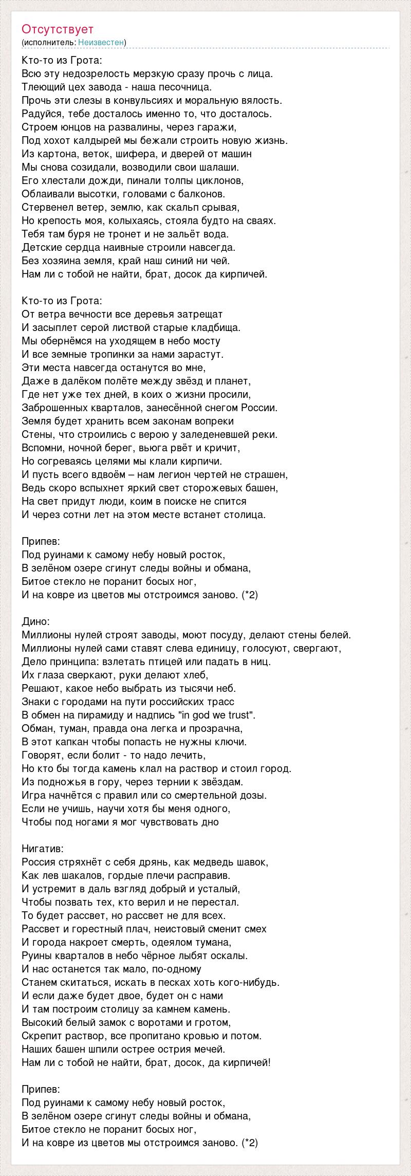 Кто-то из Грота: Всю эту недозрелость мерзкую сразу прочь с лица. Тлеющий цех завода - наша песочница. Прочь эти слезы в конвульсиях и моральную вялость. Радуйся, тебе досталось именно то, что досталось. Строем юнцов на развалины, через гаражи, Под хохот калдырей мы бежали строить новую жизнь. Из картона, веток, шифера, и дверей от машин Мы снова созидали, возводили свои шалаши. Его хлестали дожди, пинали толпы циклонов, Облаивали высотки, головами с балконов. Стервенел ветер, землю, как скальп срывая, Но крепость моя, колыхаясь, стояла будто на сваях. Тебя там буря не тронет и не зальёт вода. Детские сердца наивные строили навсегда. Без хозяина земля, край наш синий ни чей. Нам ли с тобой не найти, брат, досок да кирпичей. Кто-то из Грота: От ветра вечности все деревья затрещат И засыплет серой листвой старые кладбища. Мы обернёмся на уходящем в небо мосту И все земные тропинки за нами зарастут. Эти места навсегда останутся во мне, Даже в далёком полёте между звёзд и планет, Где нет уже тех дней, в коих о жизни просили, Заброшенных кварталов, занесённой снегом России. Земля будет хранить всем законам вопреки Стены, что строились с верою у заледеневшей реки. Вспомни, ночной берег, вьюга рвёт и кричит, Но согреваясь целями мы клали кирпичи. И пусть всего вдвоём – нам легион чертей не страшен, Ведь скоро вспыхнет яркий свет сторожевых башен, На свет придут люди, коим в поиске не спится И через сотни лет на этом месте встанет столица. Припев: Под руинами к самому небу новый росток, В зелёном озере сгинут следы войны и обмана, Битое стекло не поранит босых ног, И на ковре из цветов мы отстроимся заново. (*2) Дино: Миллионы нулей строят заводы, моют посуду, делают стены белей. Миллионы нулей сами ставят слева единицу, голосуют, свергают, Дело принципа: взлетать птицей или падать в ниц. Их глаза сверкают, руки делают хлеб, Решают, какое небо выбрать из тысячи неб. Знаки с городами на пути российских трасс В обмен на пирамиду и надпись "in god we trust". Обман, туман, правда она легка и прозрачна, В этот капкан чтобы попасть не нужны ключи. Говорят, если болит - то надо лечить, Но кто бы тогда камень клал на раствор и стоил город. Из подножья в гору, через тернии к звёздам. Игра начнётся с правил или со смертельной дозы. Если не учишь, научи хотя бы меня одного, Чтобы под ногами я мог чувствовать дно Нигатив: Россия стряхнёт с себя дрянь, как медведь шавок, Как лев шакалов, гордые плечи расправив. И устремит в даль взгляд добрый и усталый, Чтобы позвать тех, кто верил и не перестал. То будет рассвет, но рассвет не для всех. Рассвет и горестный плач, неистовый сменит смех И города накроет смерть, одеялом тумана, Руины кварталов в небо чёрное лыбят оскалы. И нас останется так мало, по-одному Станем скитаться, искать в песках хоть кого-нибудь. И если даже будет двое, будет он с нами И там построим столицу за камнем камень. Высокий белый замок с воротами и гротом, Скрепит раствор, все пропитано кровью и потом. Наших башен шпили острее острия мечей. Нам ли с тобой не найти, брат, досок, да кирпичей! Припев: Под руинами к самому небу новый росток, В зелёном озере сгинут следы войны и обмана, Битое стекло не поранит босых ног, И на ковре из цветов мы отстроимся заново. (*2)