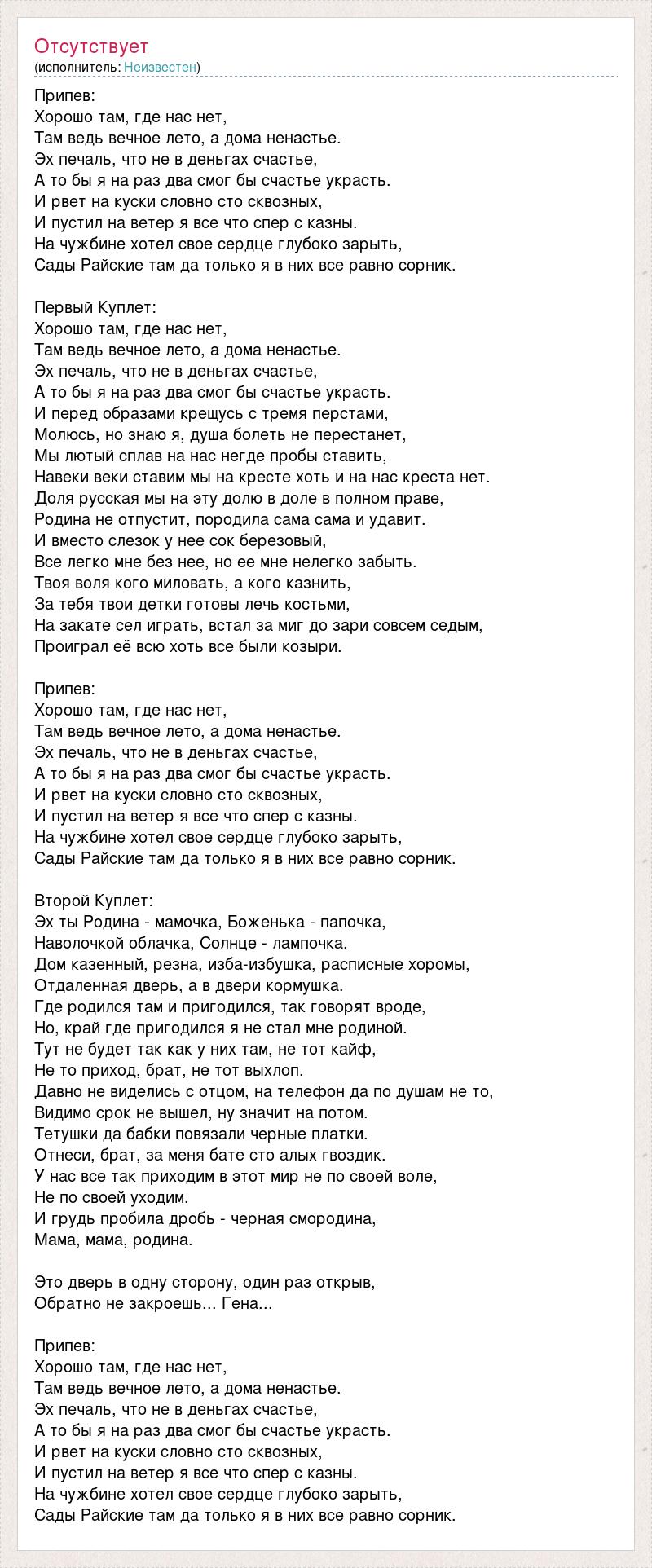 Припев: Хорошо там, где нас нет, Там ведь вечное лето, а дома ненастье. Эх печаль, что не в деньгах счастье, А то бы я на раз два смог бы счастье украсть. И рвет на куски словно сто сквозных, И пустил на ветер я все что спер с казны. На чужбине хотел свое сердце глубоко зарыть, Сады Райские там да только я в них все равно сорник. Первый Куплет: Хорошо там, где нас нет, Там ведь вечное лето, а дома ненастье. Эх печаль, что не в деньгах счастье, А то бы я на раз два смог бы счастье украсть. И перед образами крещусь с тремя перстами, Молюсь, но знаю я, душа болеть не перестанет, Мы лютый сплав на нас негде пробы ставить, Навеки веки ставим мы на кресте хоть и на нас креста нет. Доля русская мы на эту долю в доле в полном праве, Родина не отпустит, породила сама сама и удавит. И вместо слезок у нее сок березовый, Все легко мне без нее, но ее мне нелегко забыть. Твоя воля кого миловать, а кого казнить, За тебя твои детки готовы лечь костьми, На закате сел играть, встал за миг до зари совсем седым, Проиграл её всю хоть все были козыри. Припев: Хорошо там, где нас нет, Там ведь вечное лето, а дома ненастье. Эх печаль, что не в деньгах счастье, А то бы я на раз два смог бы счастье украсть. И рвет на куски словно сто сквозных, И пустил на ветер я все что спер с казны. На чужбине хотел свое сердце глубоко зарыть, Сады Райские там да только я в них все равно сорник. Второй Куплет: Эх ты Родина - мамочка, Боженька - папочка, Наволочкой облачка, Солнце - лампочка. Дом казенный, резна, изба-избушка, расписные хоромы, Отдаленная дверь, а в двери кормушка. Где родился там и пригодился, так говорят вроде, Но, край где пригодился я не стал мне родиной. Тут не будет так как у них там, не тот кайф, Не то приход, брат, не тот выхлоп. Давно не виделись с отцом, на телефон да по душам не то, Видимо срок не вышел, ну значит на потом. Тетушки да бабки повязали черные платки. Отнеси, брат, за меня бате сто алых гвоздик. У нас все так приходим в этот мир не по своей воле, Не по своей уходим. И грудь пробила дробь - черная смородина, Мама, мама, родина. Это дверь в одну сторону, один раз открыв, Обратно не закроешь... Гена... Припев: Хорошо там, где нас нет, Там ведь вечное лето, а дома ненастье. Эх печаль, что не в деньгах счастье, А то бы я на раз два смог бы счастье украсть. И рвет на куски словно сто сквозных, И пустил на ветер я все что спер с казны. На чужбине хотел свое сердце глубоко зарыть, Сады Райские там да только я в них все равно сорник.
