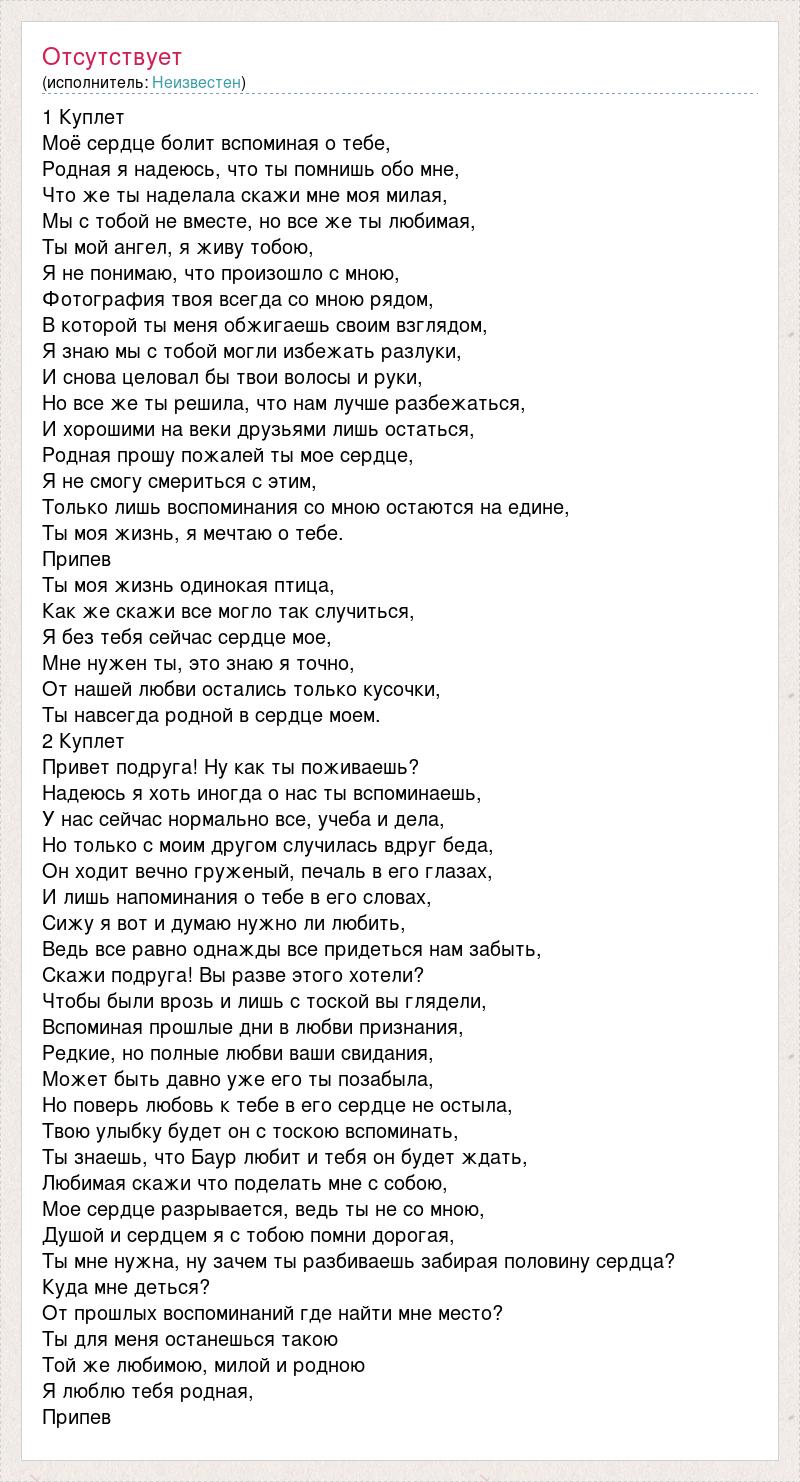 1 Куплет Моё сердце болит вспоминая о тебе, Родная я надеюсь, что ты помнишь обо мне, Что же ты наделала скажи мне моя милая, Мы с тобой не вместе, но все же ты любимая, Ты мой ангел, я живу тобою, Я не понимаю, что произошло с мною, Фотография твоя всегда со мною рядом, В которой ты меня обжигаешь своим взглядом, Я знаю мы с тобой могли избежать разлуки, И снова целовал бы твои волосы и руки, Но все же ты решила, что нам лучше разбежаться, И хорошими на веки друзьями лишь остаться, Родная прошу пожалей ты мое сердце, Я не смогу смериться с этим, Только лишь воспоминания со мною остаются на едине, Ты моя жизнь, я мечтаю о тебе. Припев Ты моя жизнь одинокая птица, Как же скажи все могло так случиться, Я без тебя сейчас сердце мое, Мне нужен ты, это знаю я точно, От нашей любви остались только кусочки, Ты навсегда родной в сердце моем. 2 Куплет Привет подруга! Ну как ты поживаешь? Надеюсь я хоть иногда о нас ты вспоминаешь, У нас сейчас нормально все, учеба и дела, Но только с моим другом случилась вдруг беда, Он ходит вечно груженый, печаль в его глазах, И лишь напоминания о тебе в его словах, Сижу я вот и думаю нужно ли любить, Ведь все равно однажды все придеться нам забыть, Скажи подруга! Вы разве этого хотели? Чтобы были врозь и лишь с тоской вы глядели, Вспоминая прошлые дни в любви признания, Редкие, но полные любви ваши свидания, Может быть давно уже его ты позабыла, Но поверь любовь к тебе в его сердце не остыла, Твою улыбку будет он с тоскою вспоминать, Ты знаешь, что Баур любит и тебя он будет ждать, Любимая скажи что поделать мне с собою, Мое сердце разрывается, ведь ты не со мною, Душой и сердцем я с тобою помни дорогая, Ты мне нужна, ну зачем ты разбиваешь забирая половину сердца? Куда мне деться? От прошлых воспоминаний где найти мне место? Ты для меня останешься такою Той же любимою, милой и родною Я люблю тебя родная, Припев