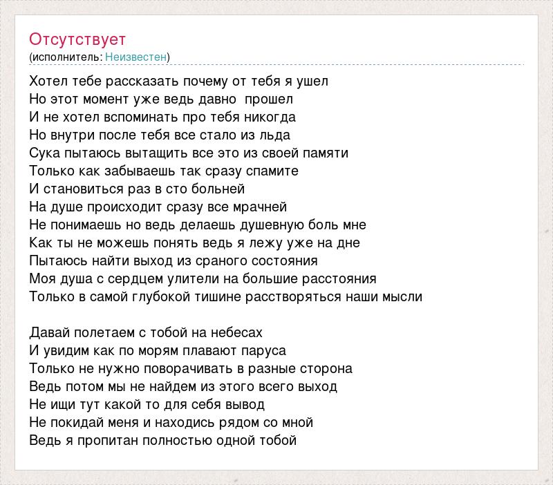 Хотел тебе рассказать почему от тебя я ушел Но этот момент уже ведь давно прошел И не хотел вспоминать про тебя никогда Но внутри после тебя все стало из льда Сука пытаюсь вытащить все это из своей памяти Только как забываешь так сразу спамите И становиться раз в сто больней На душе происходит сразу все мрачней Не понимаешь но ведь делаешь душевную боль мне Как ты не можешь понять ведь я лежу уже на дне Пытаюсь найти выход из сраного состояния Моя душа с сердцем улители на большие расстояния Только в самой глубокой тишине расстворяться наши мысли Давай полетаем с тобой на небесах И увидим как по морям плавают паруса Только не нужно поворачивать в разные сторона Ведь потом мы не найдем из этого всего выход Не ищи тут какой то для себя вывод Не покидай меня и находись рядом со мной Ведь я пропитан полностью одной тобой