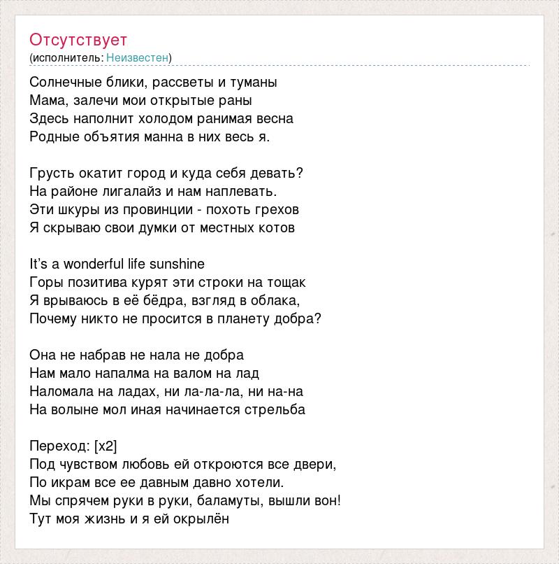 Солнечные блики, рассветы и туманы Мама, залечи мои открытые раны Здесь наполнит холодом ранимая весна Родные объятия манна в них весь я. Грусть окатит город и куда себя девать? На районе лигалайз и нам наплевать. Эти шкуры из провинции - похоть грехов Я скрываю свои думки от местных котов It’s a wonderful life sunshine Горы позитива курят эти строки на тощак Я врываюсь в её бёдра, взгляд в облака, Почему никто не просится в планету добра? Она не набрав не нала не добра Нам мало напалма на валом на лад Наломала на ладах, ни ла-ла-ла, ни на-на На волыне мол иная начинается стрельба Переход: [х2] Под чувством любовь ей откроются все двери, По икрам все ее давным давно хотели. Мы спрячем руки в руки, баламуты, вышли вон! Тут моя жизнь и я ей окрылён