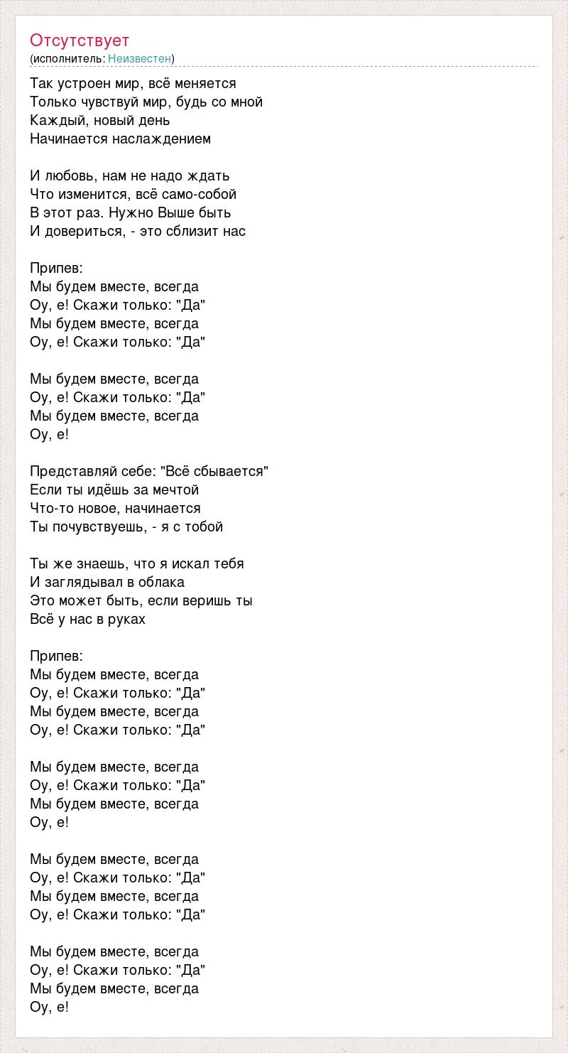 Так устроен мир, всё меняется Только чувствуй мир, будь со мной Каждый, новый день Начинается наслаждением И любовь, нам не надо ждать Что изменится, всё само-собой В этот раз. Нужно Выше быть И довериться, - это сблизит нас Припев: Мы будем вместе, всегда Оу, е! Скажи только: "Да" Мы будем вместе, всегда Оу, е! Скажи только: "Да" Мы будем вместе, всегда Оу, е! Скажи только: "Да" Мы будем вместе, всегда Оу, е! Представляй себе: "Всё сбывается" Если ты идёшь за мечтой Что-то новое, начинается Ты почувствуешь, - я с тобой Ты же знаешь, что я искал тебя И заглядывал в облака Это может быть, если веришь ты Всё у нас в руках Припев: Мы будем вместе, всегда Оу, е! Скажи только: "Да" Мы будем вместе, всегда Оу, е! Скажи только: "Да" Мы будем вместе, всегда Оу, е! Скажи только: "Да" Мы будем вместе, всегда Оу, е! Мы будем вместе, всегда Оу, е! Скажи только: "Да" Мы будем вместе, всегда Оу, е! Скажи только: "Да" Мы будем вместе, всегда Оу, е! Скажи только: "Да" Мы будем вместе, всегда Оу, е!
