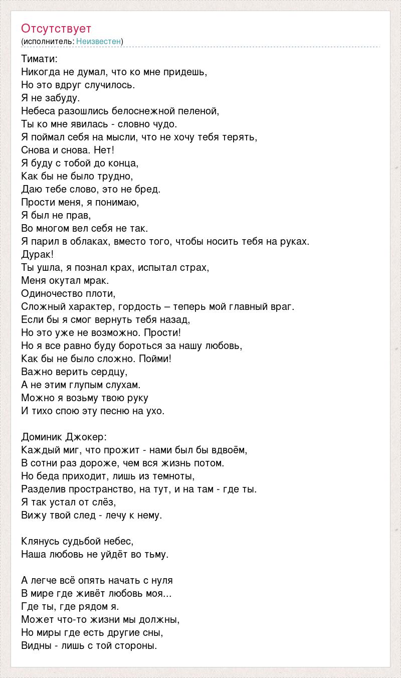 Тимати: Никогда не думал, что ко мне придешь, Но это вдруг случилось. Я не забуду. Небеса разошлись белоснежной пеленой, Ты ко мне явилась - словно чудо. Я поймал себя на мысли, что не хочу тебя терять, Снова и снова. Нет! Я буду с тобой до конца, Как бы не было трудно, Даю тебе слово, это не бред. Прости меня, я понимаю, Я был не прав, Во многом вел себя не так. Я парил в облаках, вместо того, чтобы носить тебя на руках. Дурак! Ты ушла, я познал крах, испытал страх, Меня окутал мрак. Одиночество плоти, Сложный характер, гордость – теперь мой главный враг. Если бы я смог вернуть тебя назад, Но это уже не возможно. Прости! Но я все равно буду бороться за нашу любовь, Как бы не было сложно. Пойми! Важно верить сердцу, А не этим глупым слухам. Можно я возьму твою руку И тихо спою эту песню на ухо. Доминик Джокер: Каждый миг, что прожит - нами был бы вдвоём, В сотни раз дороже, чем вся жизнь потом. Но беда приходит, лишь из темноты, Разделив пространство, на тут, и на там - где ты. Я так устал от слёз, Вижу твой след - лечу к нему. Клянусь судьбой небес, Наша любовь не уйдёт во тьму. А легче всё опять начать с нуля В мире где живёт любовь моя... Где ты, где рядом я. Может что-то жизни мы должны, Но миры где есть другие сны, Видны - лишь с той стороны.