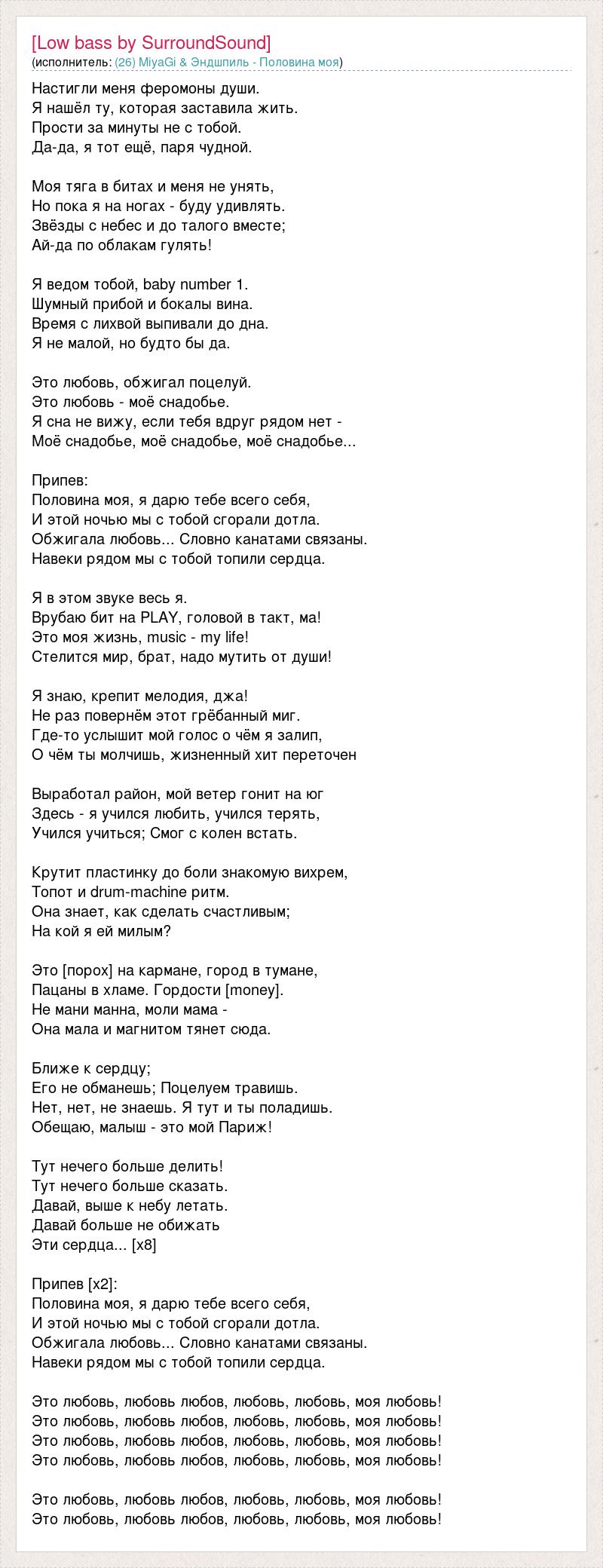 Настигли меня феромоны души. Я нашёл ту, которая заставила жить. Прости за минуты не с тобой. Да-да, я тот ещё, паря чудной. Моя тяга в битах и меня не унять, Но пока я на ногах - буду удивлять. Звёзды с небес и до талого вместе; Ай-да по облакам гулять! Я ведом тобой, baby number 1. Шумный прибой и бокалы вина. Время с лихвой выпивали до дна. Я не малой, но будто бы да. Это любовь, обжигал поцелуй. Это любовь - моё снадобье. Я сна не вижу, если тебя вдруг рядом нет - Моё снадобье, моё снадобье, моё снадобье... Припев: Половина моя, я дарю тебе всего себя, И этой ночью мы с тобой сгорали дотла. Обжигала любовь... Словно канатами связаны. Навеки рядом мы с тобой топили сердца. Я в этом звуке весь я. Врубаю бит на PLAY, головой в такт, ма! Это моя жизнь, music - my life! Стелится мир, брат, надо мутить от души! Я знаю, крепит мелодия, джа! Не раз повернём этот грёбанный миг. Где-то услышит мой голос о чём я залип, О чём ты молчишь, жизненный хит переточен Выработал район, мой ветер гонит на юг Здесь - я учился любить, учился терять, Учился учиться; Смог с колен встать. Крутит пластинку до боли знакомую вихрем, Топот и drum-machine ритм. Она знает, как сделать счастливым; На кой я ей милым? Это [порох] на кармане, город в тумане, Пацаны в хламе. Гордости [money]. Не мани манна, моли мама - Она мала и магнитом тянет сюда. Ближе к сердцу; Его не обманешь; Поцелуем травишь. Нет, нет, не знаешь. Я тут и ты поладишь. Обещаю, малыш - это мой Париж! Тут нечего больше делить! Тут нечего больше сказать. Давай, выше к небу летать. Давай больше не обижать Эти сердца... [x8] Припев [x2]: Половина моя, я дарю тебе всего себя, И этой ночью мы с тобой сгорали дотла. Обжигала любовь... Словно канатами связаны. Навеки рядом мы с тобой топили сердца. Это любовь, любовь любов, любовь, любовь, моя любовь! Это любовь, любовь любов, любовь, любовь, моя любовь! Это любовь, любовь любов, любовь, любовь, моя любовь! Это любовь, любовь любов, любовь, любовь, моя любовь! Это любовь, любовь любов, любовь, любовь, моя любовь! Это любовь, любовь любов, любовь, любовь, моя любовь!