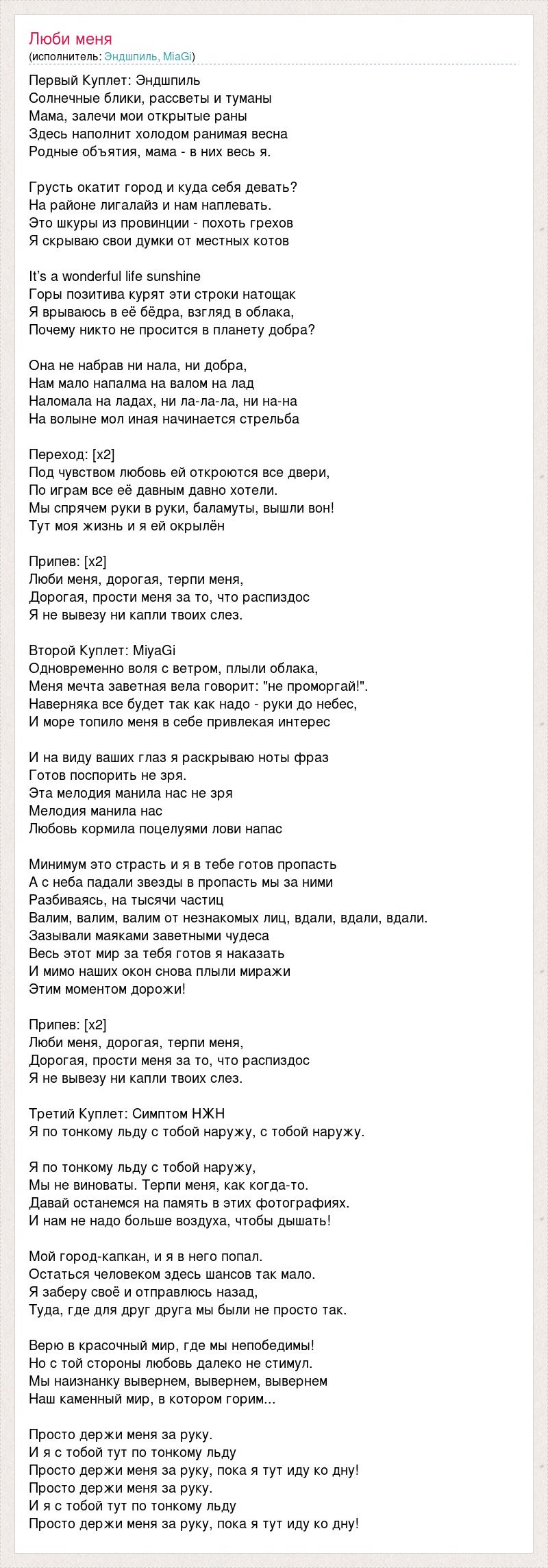 Первый Куплет: Эндшпиль Солнечные блики, рассветы и туманы Мама, залечи мои открытые раны Здесь наполнит холодом ранимая весна Родные объятия, мама - в них весь я. Грусть окатит город и куда себя девать? На районе лигалайз и нам наплевать. Это шкуры из провинции - похоть грехов Я скрываю свои думки от местных котов It’s a wonderful life sunshine Горы позитива курят эти строки натощак Я врываюсь в её бёдра, взгляд в облака, Почему никто не просится в планету добра? Она не набрав ни нала, ни добра, Нам мало напалма на валом на лад Наломала на ладах, ни ла-ла-ла, ни на-на На волыне мол иная начинается стрельба Переход: [х2] Под чувством любовь ей откроются все двери, По играм все её давным давно хотели. Мы спрячем руки в руки, баламуты, вышли вон! Тут моя жизнь и я ей окрылён Припев: [х2] Люби меня, дорогая, терпи меня, Дорогая, прости меня за то, что распиздос Я не вывезу ни капли твоих слез. Второй Куплет: MiyaGi Одновременно воля с ветром, плыли облака, Меня мечта заветная вела говорит: "не проморгай!". Наверняка все будет так как надо - руки до небес, И море топило меня в себе привлекая интерес И на виду ваших глаз я раскрываю ноты фраз Готов поспорить не зря. Эта мелодия манила нас не зря Мелодия манила нас Любовь кормила поцелуями лови напас Минимум это страсть и я в тебе готов пропасть А с неба падали звезды в пропасть мы за ними Разбиваясь, на тысячи частиц Валим, валим, валим от незнакомых лиц, вдали, вдали, вдали. Зазывали маяками заветными чудеса Весь этот мир за тебя готов я наказать И мимо наших окон снова плыли миражи Этим моментом дорожи! Припев: [х2] Люби меня, дорогая, терпи меня, Дорогая, прости меня за то, что распиздос Я не вывезу ни капли твоих слез. Третий Куплет: Симптом НЖН Я по тонкому льду с тобой наружу, с тобой наружу. Я по тонкому льду с тобой наружу, Мы не виноваты. Терпи меня, как когда-то. Давай останемся на память в этих фотографиях. И нам не надо больше воздуха, чтобы дышать! Мой город-капкан, и я в него попал. Остаться человеком здесь шансов так мало. Я заберу своё и отправлюсь назад, Туда, где для друг друга мы были не просто так. Верю в красочный мир, где мы непобедимы! Но с той стороны любовь далеко не стимул. Мы наизнанку вывернем, вывернем, вывернем Наш каменный мир, в котором горим... Просто держи меня за руку. И я с тобой тут по тонкому льду Просто держи меня за руку, пока я тут иду ко дну! Просто держи меня за руку. И я с тобой тут по тонкому льду Просто держи меня за руку, пока я тут иду ко дну!