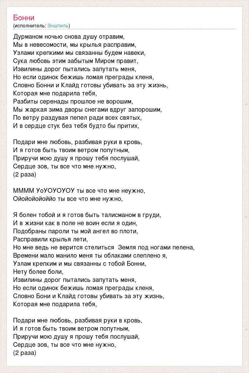 Дурманом ночью снова душу отравим, Мы в невесомости, мы крылья расправим, Узлами крепкими мы связанны будем навеки, Сука любовь этим забытым Миром правит, Извилины дорог пытались запутать меня, Но если одинок бежишь ломая преграды кленя, Словно Бонни и Клайд готовы убивать за эту жизнь, Которая мне подарила тебя, Разбиты серенады прошлое не ворошим, Мы жаркая зима дворы снегами вдруг запорошим, По ветру раздувая пепел ради всех святых, И в сердце стук без тебя будто бы притих, Подари мне любовь, разбивая руки в кровь, И я готов быть твоим ветром попутным, Приручи мою душу я прошу тебя послушай, Сердце зов, ты все что мне нужно, (2 раза) ММММ УоУОУОУОУ ты все что мне неужно, Ойойойойоййо ты все что мне нужно, Я болен тобой и я готов быть талисманом в груди, И в жизни как в поле не воин если я один, Подобраны пароли ты мой ангел во плоти, Расправили крылья лети, Но мне ведь не верится стелиться Земля под ногами пелена, Времени мало манило меня ты облаками слеплено я, Узлам крепким и мы связанны с тобой Бонни, Нету более боли, Извилины дорог пытались запутать меня, Но если одинок бежишь ломая преграды кленя, Словно Бони и Клайд готовы убивать за эту жизнь, Которая мне подарила тебя, Подари мне любовь, разбивая руки в кровь, И я готов быть твоим ветром попутным, Приручи мою душу я прошу тебя послушай, Сердце зов, ты все что мне нужно, (2 раза)