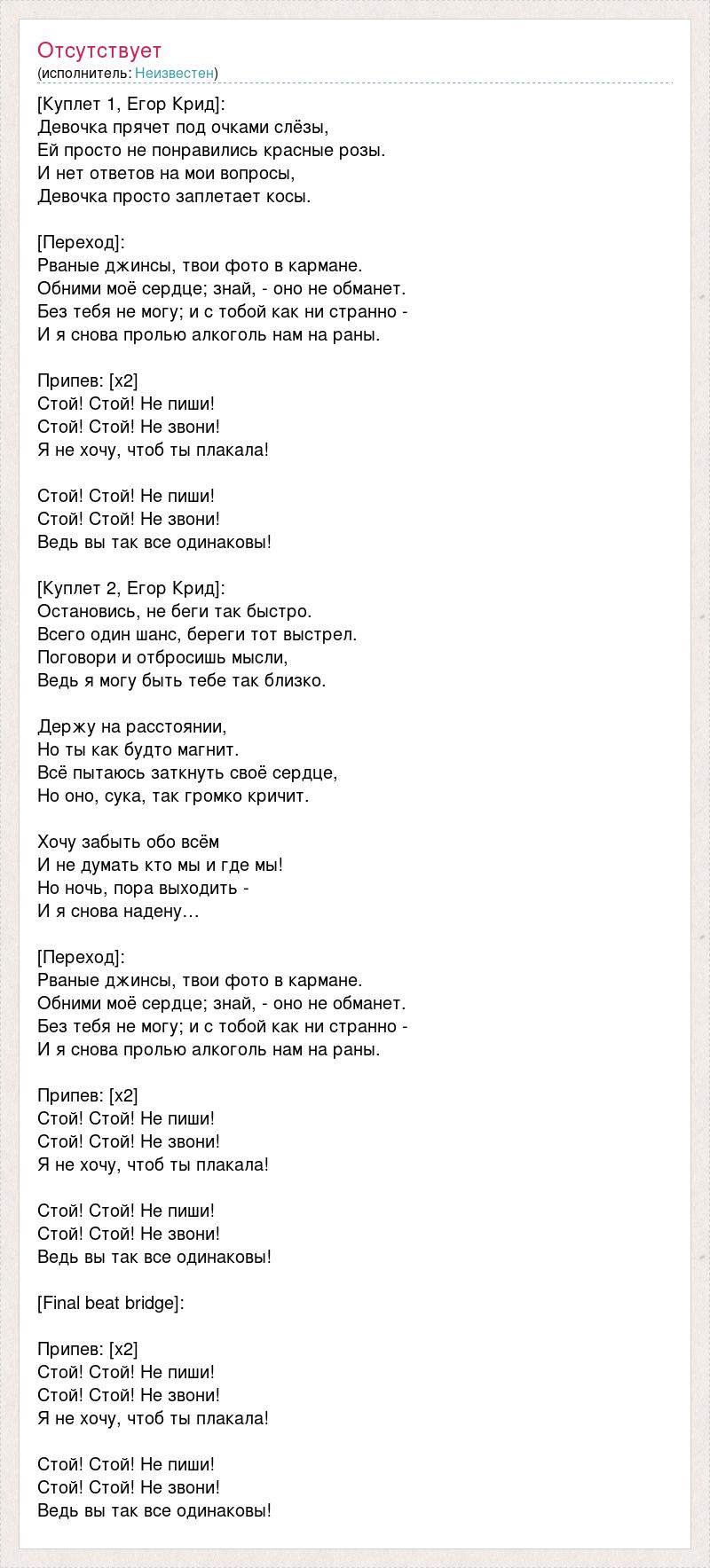 [Куплет 1, Егор Крид]: Девочка прячет под очками слёзы, Ей просто не понравились красные розы. И нет ответов на мои вопросы, Девочка просто заплетает косы. [Переход]: Рваные джинсы, твои фото в кармане. Обними моё сердце; знай, - оно не обманет. Без тебя не могу; и с тобой как ни странно - И я снова пролью алкоголь нам на раны. Припев: [x2] Стой! Стой! Не пиши! Стой! Стой! Не звони! Я не хочу, чтоб ты плакала! Стой! Стой! Не пиши! Стой! Стой! Не звони! Ведь вы так все одинаковы! [Куплет 2, Егор Крид]: Остановись, не беги так быстро. Всего один шанс, береги тот выстрел. Поговори и отбросишь мысли, Ведь я могу быть тебе так близко. Держу на расстоянии, Но ты как будто магнит. Всё пытаюсь заткнуть своё сердце, Но оно, сука, так громко кричит. Хочу забыть обо всём И не думать кто мы и где мы! Но ночь, пора выходить - И я снова надену… [Переход]: Рваные джинсы, твои фото в кармане. Обними моё сердце; знай, - оно не обманет. Без тебя не могу; и с тобой как ни странно - И я снова пролью алкоголь нам на раны. Припев: [x2] Стой! Стой! Не пиши! Стой! Стой! Не звони! Я не хочу, чтоб ты плакала! Стой! Стой! Не пиши! Стой! Стой! Не звони! Ведь вы так все одинаковы! [Final beat bridge]: Припев: [x2] Стой! Стой! Не пиши! Стой! Стой! Не звони! Я не хочу, чтоб ты плакала! Стой! Стой! Не пиши! Стой! Стой! Не звони! Ведь вы так все одинаковы!