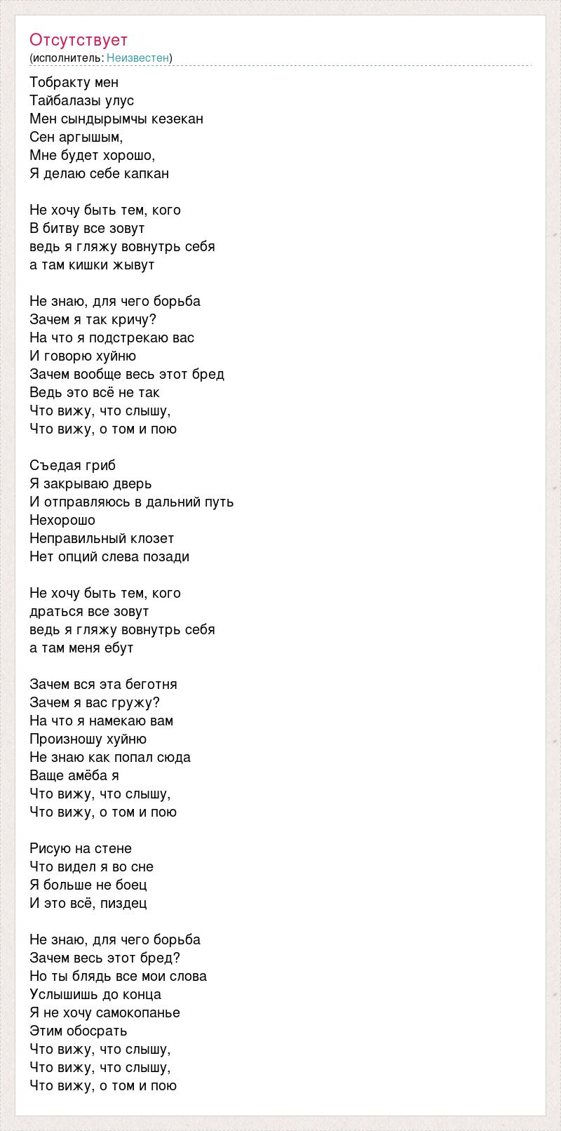 Тобракту мен Тайбалазы улус Мен сындырымчы кезекан Сен аргышым, Мне будет хорошо, Я делаю себе капкан Не хочу быть тем, кого В битву все зовут ведь я гляжу вовнутрь себя а там кишки жывут Не знаю, для чего борьба Зачем я так кричу? На что я подстрекаю вас И говорю хуйню Зачем вообще весь этот бред Ведь это всё не так Что вижу, что слышу, Что вижу, о том и пою Съедая гриб Я закрываю дверь И отправляюсь в дальний путь Нехорошо Неправильный клозет Нет опций слева позади Не хочу быть тем, кого драться все зовут ведь я гляжу вовнутрь себя а там меня ебут Зачем вся эта беготня Зачем я вас гружу? На что я намекаю вам Произношу хуйню Не знаю как попал сюда Ваще амёба я Что вижу, что слышу, Что вижу, о том и пою Рисую на стене Что видел я во сне Я больше не боец И это всё, пиздец Не знаю, для чего борьба Зачем весь этот бред? Но ты блядь все мои слова Услышишь до конца Я не хочу самокопанье Этим обосрать Что вижу, что слышу, Что вижу, что слышу, Что вижу, о том и пою