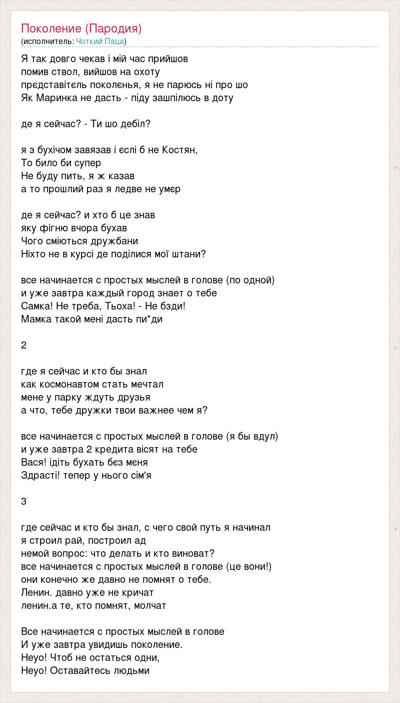 Я так довго чекав і мій час прийшов помив ствол, вийшов на охоту прєдставітєль поколєнья, я не парюсь ні про шо Як Маринка не дасть - піду зашпілюсь в доту де я сейчас? - Ти шо дебіл? я з бухічом завязав і єслі б не Костян, То било би супер Не буду пить, я ж казав а то прошлий раз я ледве не умєр де я сейчас? и хто б це знав яку фігню вчора бухав Чого сміються дружбани Ніхто не в курсі де поділися мої штани? все начинается с простых мыслей в голове (по одной) и уже завтра каждый город знает о тебе Самка! Не треба, Тьоха! - Не бзди! Мамка такой мені дасть пи*ди 2 где я сейчас и кто бы знал как космонавтом стать мечтал мене у парку ждуть друзья а что, тебе дружки твои важнее чем я? все начинается с простых мыслей в голове (я бы вдул) и уже завтра 2 кредита вісят на тебе Вася! ідіть бухать бєз мєня Здрасті! тепер у нього сім'я 3 где сейчас и кто бы знал, с чего свой путь я начинал я строил рай, построил ад немой вопрос: что делать и кто виноват? все начинается с простых мыслей в голове (це вони!) они конечно же давно не помнят о тебе. Ленин. давно уже не кричат ленин.а те, кто помнят, молчат Все начинается с простых мыслей в голове И уже завтра увидишь поколение. Heyo! Чтоб не остаться одни, Heyo! Оставайтесь людьми
