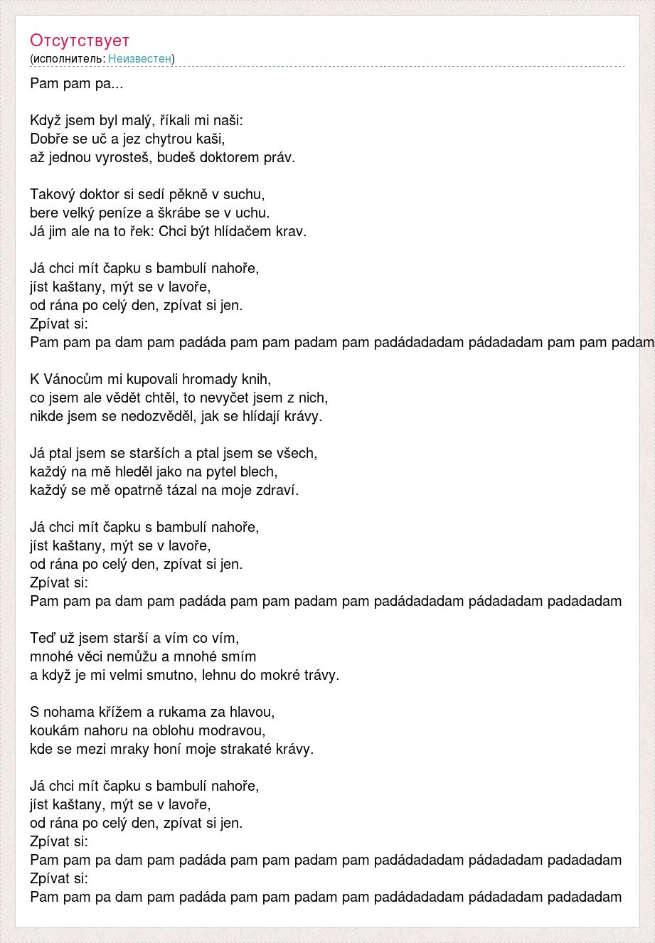 Pam pam pa... Když jsem byl malý, říkali mi naši: Dobře se uč a jez chytrou kaši, až jednou vyrosteš, budeš doktorem práv. Takový doktor si sedí pěkně v suchu, bere velký peníze a škrábe se v uchu. Já jim ale na to řek: Chci být hlídačem krav. Já chci mít čapku s bambulí nahoře, jíst kaštany, mýt se v lavoře, od rána po celý den, zpívat si jen. Zpívat si: Pam pam pa dam pam padáda pam pam padam pam padádadadam pádadadam pam pam padam K Vánocům mi kupovali hromady knih, co jsem ale vědět chtěl, to nevyčet jsem z nich, nikde jsem se nedozvěděl, jak se hlídají krávy. Já ptal jsem se starších a ptal jsem se všech, každý na mě hleděl jako na pytel blech, každý se mě opatrně tázal na moje zdraví. Já chci mít čapku s bambulí nahoře, jíst kaštany, mýt se v lavoře, od rána po celý den, zpívat si jen. Zpívat si: Pam pam pa dam pam padáda pam pam padam pam padádadadam pádadadam padadadam Teď už jsem starší a vím co vím, mnohé věci nemůžu a mnohé smím a když je mi velmi smutno, lehnu do mokré trávy. S nohama křížem a rukama za hlavou, koukám nahoru na oblohu modravou, kde se mezi mraky honí moje strakaté krávy. Já chci mít čapku s bambulí nahoře, jíst kaštany, mýt se v lavoře, od rána po celý den, zpívat si jen. Zpívat si: Pam pam pa dam pam padáda pam pam padam pam padádadadam pádadadam padadadam Zpívat si: Pam pam pa dam pam padáda pam pam padam pam padádadadam pádadadam padadadam