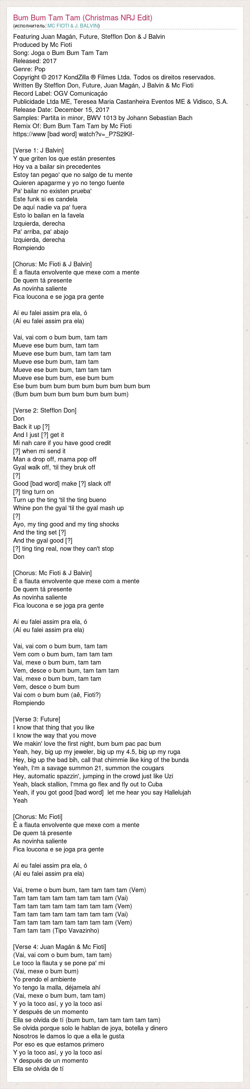 Featuring Juan Magán, Future, Stefflon Don & J Balvin Produced by Mc Fioti Song: Joga o Bum Bum Tam Tam Released: 2017 Genre: Pop Copyright © 2017 KondZilla ® Filmes Ltda. Todos os direitos reservados. Written By Stefflon Don, Future, Juan Magán, J Balvin & Mc Fioti Record Label: OGV Comunicaçáo Publicidade Ltda ME, Teresea Maria Castanheira Eventos ME & Vidisco, S.A. Release Date: December 15, 2017 Samples: Partita in minor, BWV 1013 by Johann Sebastian Bach Remix Of: Bum Bum Tam Tam by Mc Fioti https://www [bad word] watch?v=_P7S2lKif- [Verse 1: J Balvin] Y que griten los que están presentes Hoy va a bailar sin precedentes Estoy tan pegao' que no salgo de tu mente Quieren apagarme y yo no tengo fuente Pa' bailar no existen prueba' Este funk si es candela De aquí nadie va pa' fuera Esto lo bailan en la favela Izquierda, derecha Pa' arriba, pa' abajo Izquierda, derecha Rompiendo [Chorus: Mc Fioti & J Balvin] É a flauta envolvente que mexe com a mente De quem tá presente As novinha saliente Fica loucona e se joga pra gente Aí eu falei assim pra ela, ó (Aí eu falei assim pra ela) Vai, vai com o bum bum, tam tam Mueve ese bum bum, tam tam Mueve ese bum bum, tam tam tam Mueve ese bum bum, tam tam Mueve ese bum bum, tam tam tam Mueve ese bum bum, ese bum bum Ese bum bum bum bum bum bum bum bum bum (Bum bum bum bum bum bum bum bum) [Verse 2: Stefflon Don] Don Back it up [?] And I just [?] get it Mi nah care if you have good credit [?] when mi send it Man a drop off, mama pop off Gyal walk off, 'til they bruk off [?] Good [bad word] make [?] slack off [?] ting turn on Turn up the ting 'til the ting bueno Whine pon the gyal 'til the gyal mash up [?] Ayo, my ting good and my ting shocks And the ting set [?] And the gyal good [?] [?] ting ting real, now they can't stop Don [Chorus: Mc Fioti & J Balvin] É a flauta envolvente que mexe com a mente De quem tá presente As novinha saliente Fica loucona e se joga pra gente Aí eu falei assim pra ela, ó (Aí eu falei assim pra ela) Vai, vai com o bum bum, tam tam Vem com o bum bum, tam tam tam Vai, mexe o bum bum, tam tam Vem, desce o bum bum, tam tam tam Vai, mexe o bum bum, tam tam Vem, desce o bum bum Vai com o bum bum (aê, Fioti?) Rompiendo [Verse 3: Future] I know that thing that you like I know the way that you move We makin' love the first night, bum bum pac pac bum Yeah, hey, big up my jeweler, big up my 4.5, big up my ruga Hey, big up the bad bih, call that chimmie like king of the bunda Yeah, I'm a savage summon 21, summon the cougars Hey, automatic spazzin', jumping in the crowd just like Uzi Yeah, black stallion, I'mma go flex and fly out to Cuba Yeah, if you got good [bad word] let me hear you say Hallelujah Yeah [Chorus: Mc Fioti] É a flauta envolvente que mexe com a mente De quem tá presente As novinha saliente Fica loucona e se joga pra gente Aí eu falei assim pra ela, ó (Aí eu falei assim pra ela) Vai, treme o bum bum, tam tam tam tam (Vem) Tam tam tam tam tam tam tam tam (Vai) Tam tam tam tam tam tam tam tam (Vem) Tam tam tam tam tam tam tam tam (Vai) Tam tam tam tam tam tam tam tam (Vem) Tam tam tam (Tipo Vavazinho) [Verse 4: Juan Magán & Mc Fioti] (Vai, vai com o bum bum, tam tam) Le toco la flauta y se pone pa' mi (Vai, mexe o bum bum) Yo prendo el ambiente Yo tengo la malla, déjamela ahí (Vai, mexe o bum bum, tam tam) Y yo la toco así, y yo la toco así Y después de un momento Ella se olvida de tí (bum bum, tam tam tam tam tam) Se olvida porque solo le hablan de joya, botella y dinero Nosotros le damos lo que a ella le gusta Por eso es que estamos primero Y yo la toco así, y yo la toco así Y después de un momento Ella se olvida de tí