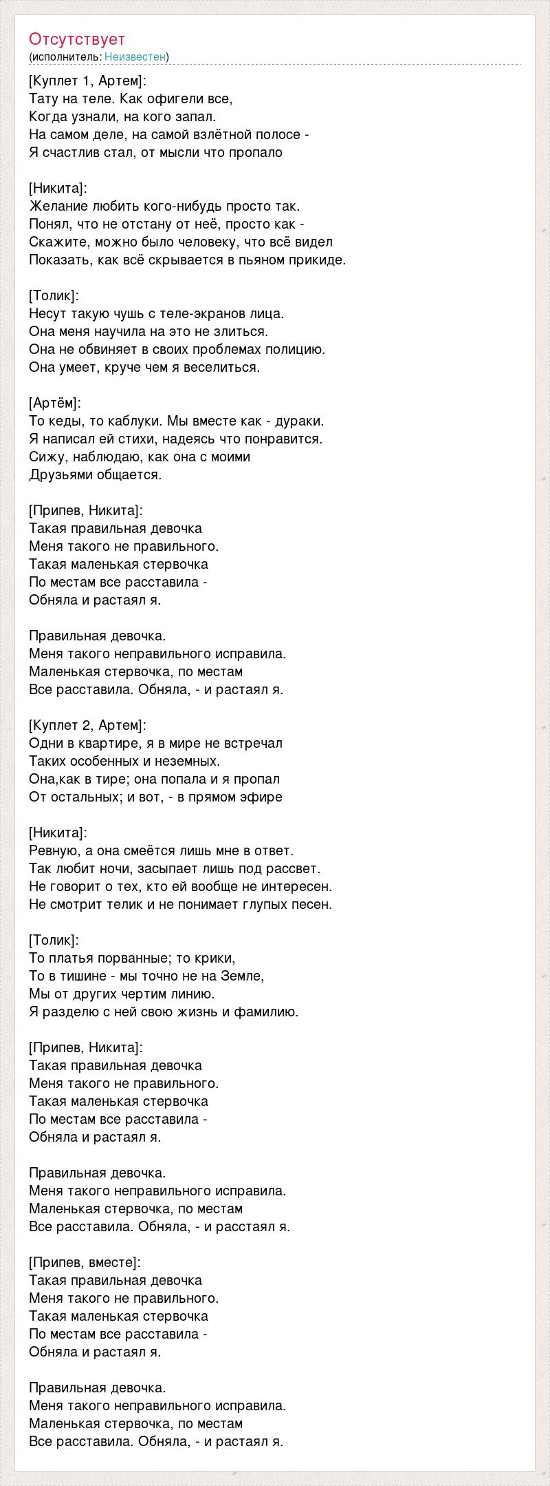 [Куплет 1, Артем]: Тату на теле. Как офигели все, Когда узнали, на кого запал. На самом деле, на самой взлётной полосе - Я счастлив стал, от мысли что пропало [Никита]: Желание любить кого-нибудь просто так. Понял, что не отстану от неё, просто как - Скажите, можно было человеку, что всё видел Показать, как всё скрывается в пьяном прикиде. [Толик]: Несут такую чушь с теле-экранов лица. Она меня научила на это не злиться. Она не обвиняет в своих проблемах полицию. Она умеет, круче чем я веселиться. [Артём]: То кеды, то каблуки. Мы вместе как - дураки. Я написал ей стихи, надеясь что понравится. Сижу, наблюдаю, как она с моими Друзьями общается. [Припев, Никита]: Такая правильная девочка Меня такого не правильного. Такая маленькая стервочка По местам все расставила - Обняла и растаял я. Правильная девочка. Меня такого неправильного исправила. Маленькая стервочка, по местам Все расставила. Обняла, - и растаял я. [Куплет 2, Артем]: Одни в квартире, я в мире не встречал Таких особенных и неземных. Она,как в тире; она попала и я пропал От остальных; и вот, - в прямом эфире [Никита]: Ревную, а она смеётся лишь мне в ответ. Так любит ночи, засыпает лишь под рассвет. Не говорит о тех, кто ей вообще не интересен. Не смотрит телик и не понимает глупых песен. [Толик]: То платья порванные; то крики, То в тишине - мы точно не на Земле, Мы от других чертим линию. Я разделю с ней свою жизнь и фамилию. [Припев, Никита]: Такая правильная девочка Меня такого не правильного. Такая маленькая стервочка По местам все расставила - Обняла и растаял я. Правильная девочка. Меня такого неправильного исправила. Маленькая стервочка, по местам Все расставила. Обняла, - и расстаял я. [Припев, вместе]: Такая правильная девочка Меня такого не правильного. Такая маленькая стервочка По местам все расставила - Обняла и растаял я. Правильная девочка. Меня такого неправильного исправила. Маленькая стервочка, по местам Все расставила. Обняла, - и растаял я.