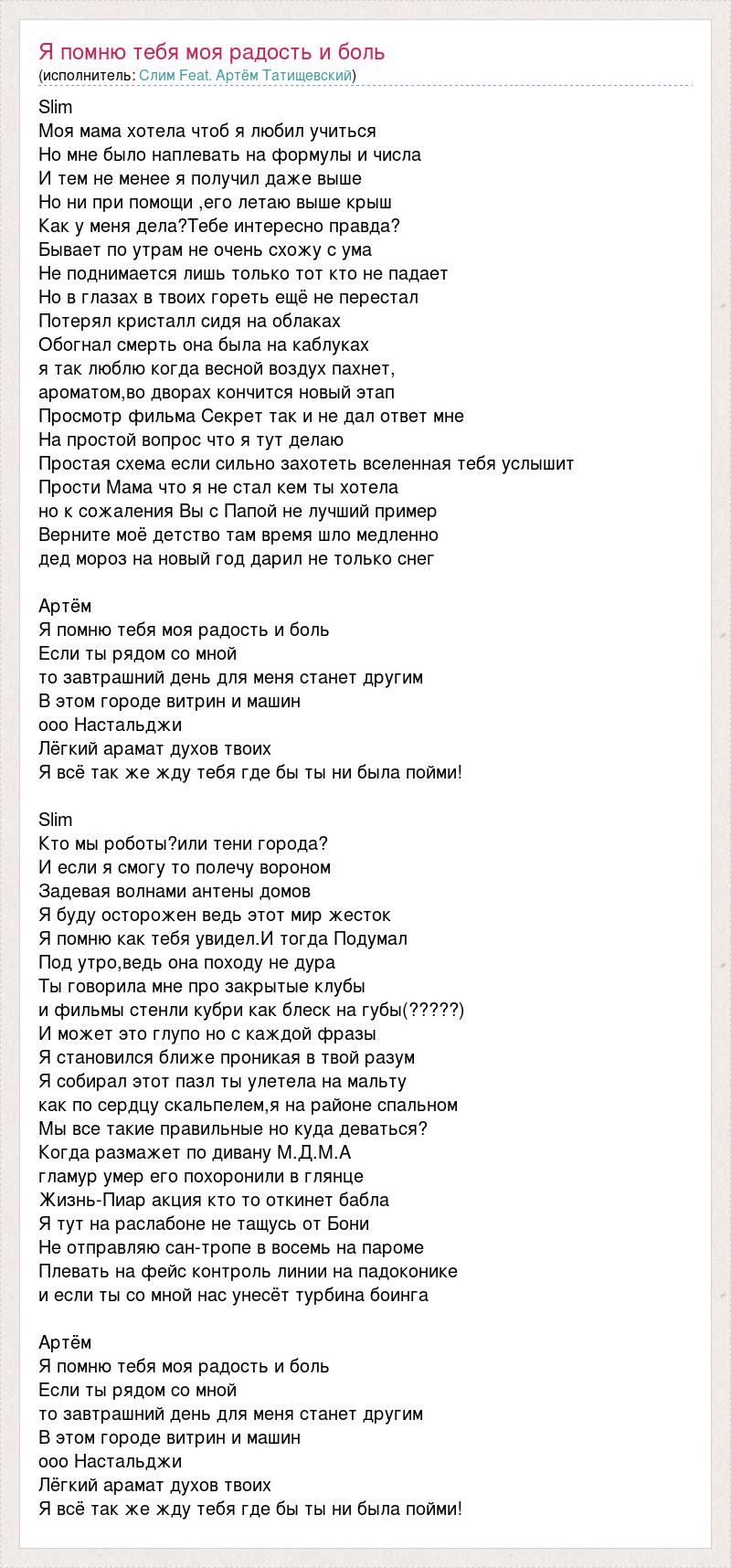Slim Моя мама хотела чтоб я любил учиться Но мне было наплевать на формулы и числа И тем не менее я получил даже выше Но ни при помощи ,его летаю выше крыш Как у меня дела?Тебе интересно правда? Бывает по утрам не очень схожу с ума Не поднимается лишь только тот кто не падает Но в глазах в твоих гореть ещё не перестал Потерял кристалл сидя на облаках Обогнал смерть она была на каблуках я так люблю когда весной воздух пахнет, ароматом,во дворах кончится новый этап Просмотр фильма Секрет так и не дал ответ мне На простой вопрос что я тут делаю Простая схема если сильно захотеть вселенная тебя услышит Прости Мама что я не стал кем ты хотела но к сожаления Вы с Папой не лучший пример Верните моё детство там время шло медленно дед мороз на новый год дарил не только снег Артём Я помню тебя моя радость и боль Если ты рядом со мной то завтрашний день для меня станет другим В этом городе витрин и машин ооо Настальджи Лёгкий арамат духов твоих Я всё так же жду тебя где бы ты ни была пойми! Slim Кто мы роботы?или тени города? И если я смогу то полечу вороном Задевая волнами антены домов Я буду осторожен ведь этот мир жесток Я помню как тебя увидел.И тогда Подумал Под утро,ведь она походу не дура Ты говорила мне про закрытые клубы и фильмы стенли кубри как блеск на губы(?????) И может это глупо но с каждой фразы Я становился ближе проникая в твой разум Я собирал этот пазл ты улетела на мальту как по сердцу скальпелем,я на районе спальном Мы все такие правильные но куда деваться? Когда размажет по дивану М.Д.М.А гламур умер его похоронили в глянце Жизнь-Пиар акция кто то откинет бабла Я тут на раслабоне не тащусь от Бони Не отправляю сан-тропе в восемь на пароме Плевать на фейс контроль линии на падоконике и если ты со мной нас унесёт турбина боинга Артём Я помню тебя моя радость и боль Если ты рядом со мной то завтрашний день для меня станет другим В этом городе витрин и машин ооо Настальджи Лёгкий арамат духов твоих Я всё так же жду тебя где бы ты ни была пойми!