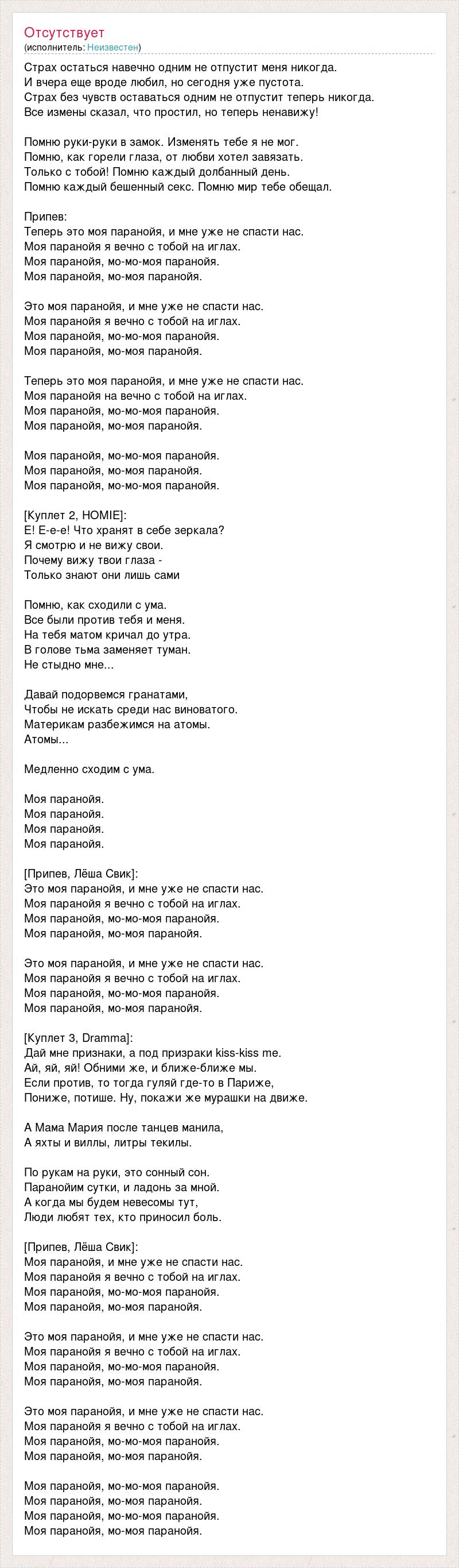 Страх остаться навечно одним не отпустит меня никогда. И вчера еще вроде любил, но сегодня уже пустота. Страх без чувств оставаться одним не отпустит теперь никогда. Все измены сказал, что простил, но теперь ненавижу! Помню руки-руки в замок. Изменять тебе я не мог. Помню, как горели глаза, от любви хотел завязать. Только с тобой! Помню каждый долбанный день. Помню каждый бешенный секс. Помню мир тебе обещал. Припев: Теперь это моя паранойя, и мне уже не спасти нас. Моя паранойя я вечно с тобой на иглах. Моя паранойя, мо-мо-моя паранойя. Моя паранойя, мо-моя паранойя. Это моя паранойя, и мне уже не спасти нас. Моя паранойя я вечно с тобой на иглах. Моя паранойя, мо-мо-моя паранойя. Моя паранойя, мо-моя паранойя. Теперь это моя паранойя, и мне уже не спасти нас. Моя паранойя на вечно с тобой на иглах. Моя паранойя, мо-мо-моя паранойя. Моя паранойя, мо-моя паранойя. Моя паранойя, мо-мо-моя паранойя. Моя паранойя, мо-моя паранойя. Моя паранойя, мо-мо-моя паранойя. [Куплет 2, HOMIE]: Е! Е-е-е! Что хранят в себе зеркала? Я смотрю и не вижу свои. Почему вижу твои глаза - Только знают они лишь сами Помню, как сходили с ума. Все были против тебя и меня. На тебя матом кричал до утра. В голове тьма заменяет туман. Не стыдно мне... Давай подорвемся гранатами, Чтобы не искать среди нас виноватого. Материкам разбежимся на атомы. Атомы... Медленно сходим с ума. Моя паранойя. Моя паранойя. Моя паранойя. Моя паранойя. [Припев, Лёша Свик]: Это моя паранойя, и мне уже не спасти нас. Моя паранойя я вечно с тобой на иглах. Моя паранойя, мо-мо-моя паранойя. Моя паранойя, мо-моя паранойя. Это моя паранойя, и мне уже не спасти нас. Моя паранойя я вечно с тобой на иглах. Моя паранойя, мо-мо-моя паранойя. Моя паранойя, мо-моя паранойя. [Куплет 3, Dramma]: Дай мне признаки, а под призраки kiss-kiss me. Ай, яй, яй! Обними же, и ближе-ближе мы. Если против, то тогда гуляй где-то в Париже, Пониже, потише. Ну, покажи же мурашки на движе. А Мама Мария после танцев манила, А яхты и виллы, литры текилы. По рукам на руки, это сонный сон. Паранойим сутки, и ладонь за мной. А когда мы будем невесомы тут, Люди любят тех, кто приносил боль. [Припев, Лёша Свик]: Моя паранойя, и мне уже не спасти нас. Моя паранойя я вечно с тобой на иглах. Моя паранойя, мо-мо-моя паранойя. Моя паранойя, мо-моя паранойя. Это моя паранойя, и мне уже не спасти нас. Моя паранойя я вечно с тобой на иглах. Моя паранойя, мо-мо-моя паранойя. Моя паранойя, мо-моя паранойя. Это моя паранойя, и мне уже не спасти нас. Моя паранойя я вечно с тобой на иглах. Моя паранойя, мо-мо-моя паранойя. Моя паранойя, мо-моя паранойя. Моя паранойя, мо-мо-моя паранойя. Моя паранойя, мо-моя паранойя. Моя паранойя, мо-мо-моя паранойя. Моя паранойя, мо-моя паранойя.