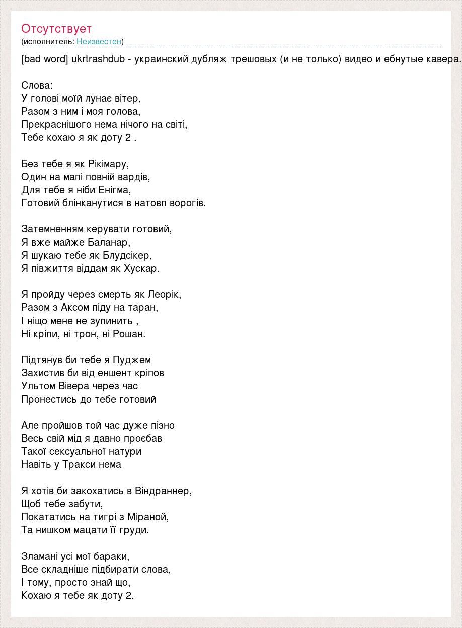 [bad word] ukrtrashdub - украинский дубляж трешовых (и не только) видео и ебнутые кавера. Слова: У голові моїй лунає вітер, Разом з ним і моя голова, Прекраснішого нема нічого на світі, Тебе кохаю я як доту 2 . Без тебе я як Рікімару, Один на мапі повній вардів, Для тебе я ніби Енігма, Готовий блінканутися в натовп ворогів. Затемненням керувати готовий, Я вже майже Баланар, Я шукаю тебе як Блудсікер, Я півжиття віддам як Хускар. Я пройду через смерть як Леорік, Разом з Аксом піду на таран, І ніщо мене не зупинить , Ні кріпи, ні трон, ні Рошан. Підтянув би тебе я Пуджем Захистив би від еншент кріпов Ультом Вівера через час Пронестись до тебе готовий Але пройшов той час дуже пізно Весь свій мід я давно проєбав Такої сексуальної натури Навіть у Тракси нема Я хотів би закохатись в Віндраннер, Щоб тебе забути, Покататись на тигрі з Міраной, Та нишком мацати її груди. Зламані усі мої бараки, Все складніше підбирати слова, І тому, просто знай що, Кохаю я тебе як доту 2.