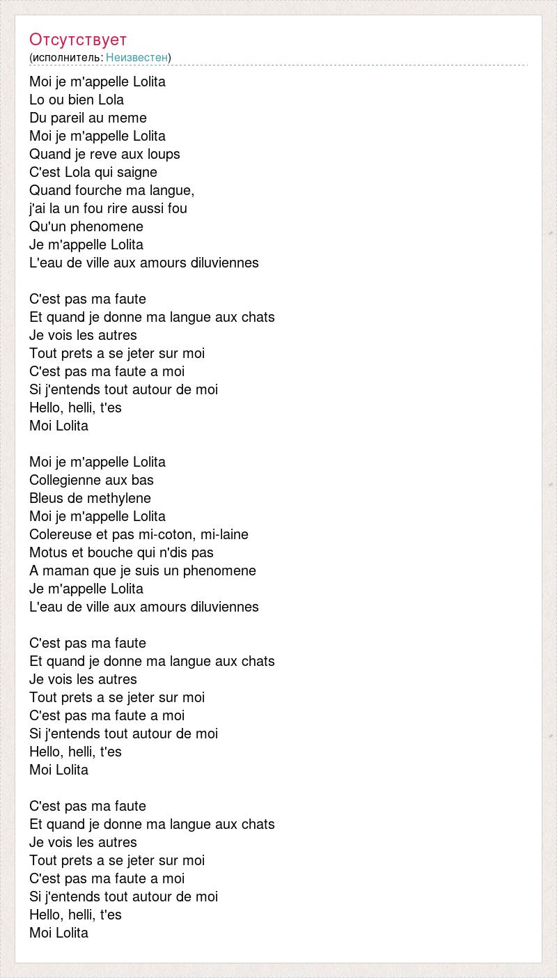 Moi je m'appelle Lolita Lo ou bien Lola Du pareil au meme Moi je m'appelle Lolita Quand je reve aux loups C'est Lola qui saigne Quand fourche ma langue, j'ai lа un fou rire aussi fou Qu'un phenomene Je m'appelle Lolita L'eau de ville aux amours diluviennes C'est pas ma faute Et quand je donne ma langue aux chats Je vois les autres Tout prets а se jeter sur moi C'est pas ma faute а moi Si j'entends tout autour de moi Hello, helli, t'es Moi Lolita Moi je m'appelle Lolita Collegienne aux bas Bleus de methylene Moi je m'appelle Lolita Colereuse et pas mi-coton, mi-laine Motus et bouche qui n'dis pas А maman que je suis un phenomene Je m'appelle Lolita L'eau de ville aux amours diluviennes C'est pas ma faute Et quand je donne ma langue aux chats Je vois les autres Tout prets а se jeter sur moi C'est pas ma faute а moi Si j'entends tout autour de moi Hello, helli, t'es Moi Lolita C'est pas ma faute Et quand je donne ma langue aux chats Je vois les autres Tout prets а se jeter sur moi C'est pas ma faute а moi Si j'entends tout autour de moi Hello, helli, t'es Moi Lolita