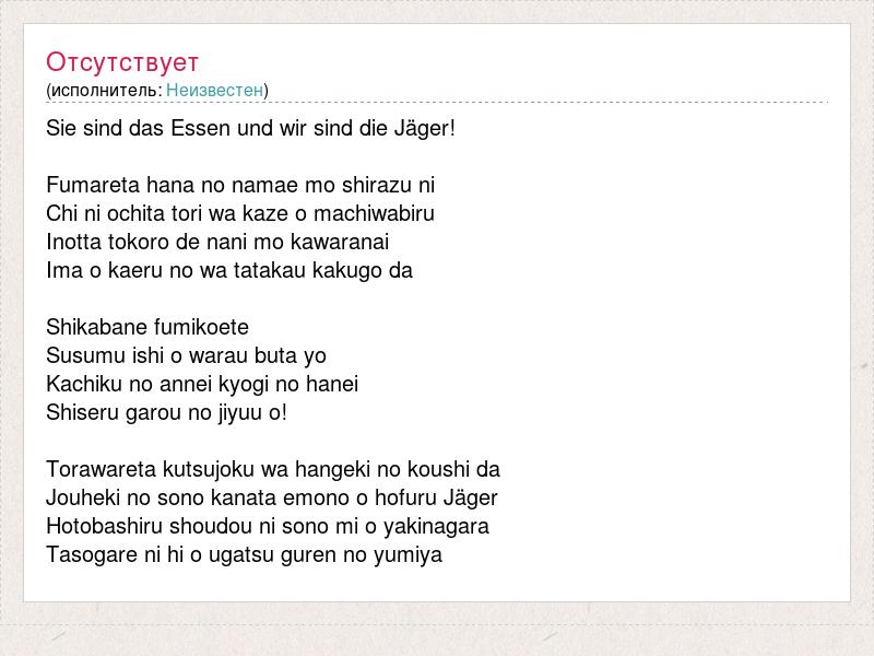 Sie sind das Essen und wir sind die Jäger! Fumareta hana no namae mo shirazu ni Chi ni ochita tori wa kaze o machiwabiru Inotta tokoro de nani mo kawaranai Ima o kaeru no wa tatakau kakugo da Shikabane fumikoete Susumu ishi o warau buta yo Kachiku no annei kyogi no hanei Shiseru garou no jiyuu o! Torawareta kutsujoku wa hangeki no koushi da Jouheki no sono kanata emono o hofuru Jäger Hotobashiru shoudou ni sono mi o yakinagara Tasogare ni hi o ugatsu guren no yumiya