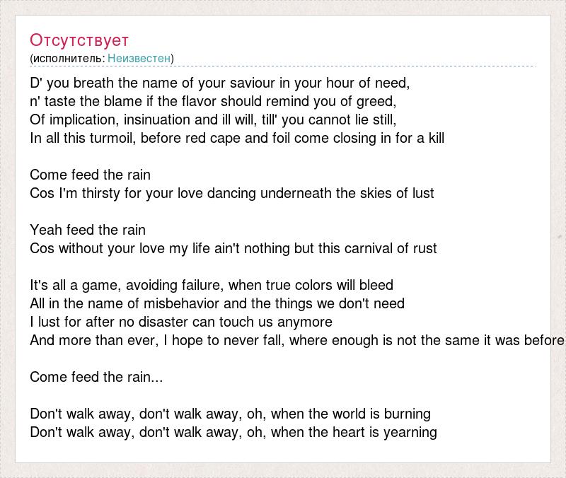 D' you breath the name of your saviour in your hour of need, n' taste the blame if the flavor should remind you of greed, Of implication, insinuation and ill will, till' you cannot lie still, In all this turmoil, before red cape and foil come closing in for a kill Come feed the rain Cos I'm thirsty for your love dancing underneath the skies of lust Yeah feed the rain Cos without your love my life ain't nothing but this carnival of rust It's all a game, avoiding failure, when true colors will bleed All in the name of misbehavior and the things we don't need I lust for after no disaster can touch us anymore And more than ever, I hope to never fall, where enough is not the same it was before Come feed the rain... Don't walk away, don't walk away, oh, when the world is burning Don't walk away, don't walk away, oh, when the heart is yearning