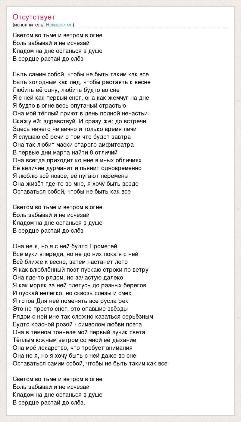 Светом во тьме и ветром в огне Боль забывай и не исчезай Кладом на дне останься в душе В сердце растай до слёз Быть самим собой, чтобы не быть таким как все Быть холодным как лёд, чтобы растаять к весне Любить её одну, любить будто во сне Я с ней как первый снег, она как жемчуг на дне Я будто в огне весь опутаный страстью Она мой тёплый приют в день полной ненастьи Скажу ей: здравствуй. И сразу же: до встречи Здесь ничего не вечно и только время лечит Я слушаю её речи о том что будет завтра Она так любит маски старого амфитеатра В первые дни марта найти 8 отличий Она всегда приходит ко мне в иных обличиях Её величие дурманит и пьянит одновременно Я люблю всё новое, её пугают перемены Она живёт где-то во мне, я хочу быть везде Оставаться собой, чтобы не быть как все Светом во тьме и ветром в огне Боль забывай и не исчезай Кладом на дне останься в душе В сердце растай до слёз Она не я, но я с ней будто Прометей Все муки впереди, но не до них пока я с ней Всё ближе к весне, затем настанет лето Я как влюблённый поэт пускаю строки по ветру Она где-то рядом, но зачастую далеко Я как моряк за ней плетусь до разных берегов И пускай нелегко, но сквозь слёзы и смех Я готов Для неё поменять все русла рек Это не просто снег, это опавшие звёзды Рядом с ней мне так сложно казаться серьёзным Будто красной розой - символом любви поэта Она в тёмном тоннеле мой первый лучик света Тёплым южным ветром со мной её дыхание Она моё лекарство, что требует внимания Она не я, но я хочу быть с ней даже во сне Оставаться самим собой, чтобы не быть таким как все Светом во тьме и ветром в огне Боль забывай и не исчезай Кладом на дне останься в душе В сердце растай до слёз.