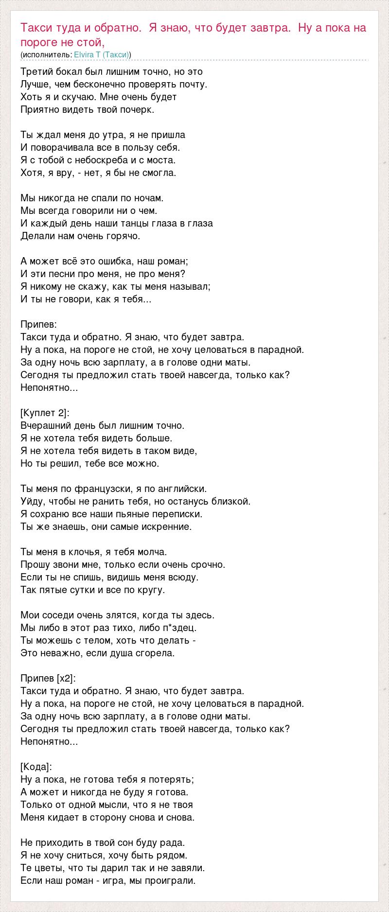 ГлавнаяИсполнителиElvira T (Такси)Такси туда и обратно.  Я знаю, что будет завтра.  Ну а пока на пороге н
