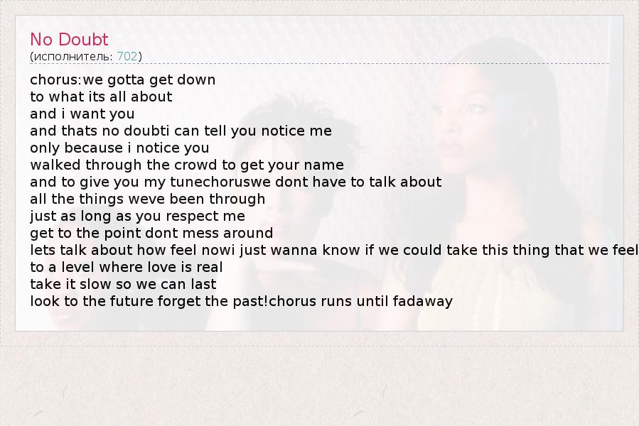 Это интересно:Название группы 702 — код города Лас-Вегас, откуда родом RnB трио. Солистка группы — Kameelah Williams, остальные участницы – сестры Irish и LeMisha Grinstead. Открыл 702 Michael Bivins из группы New Edition.