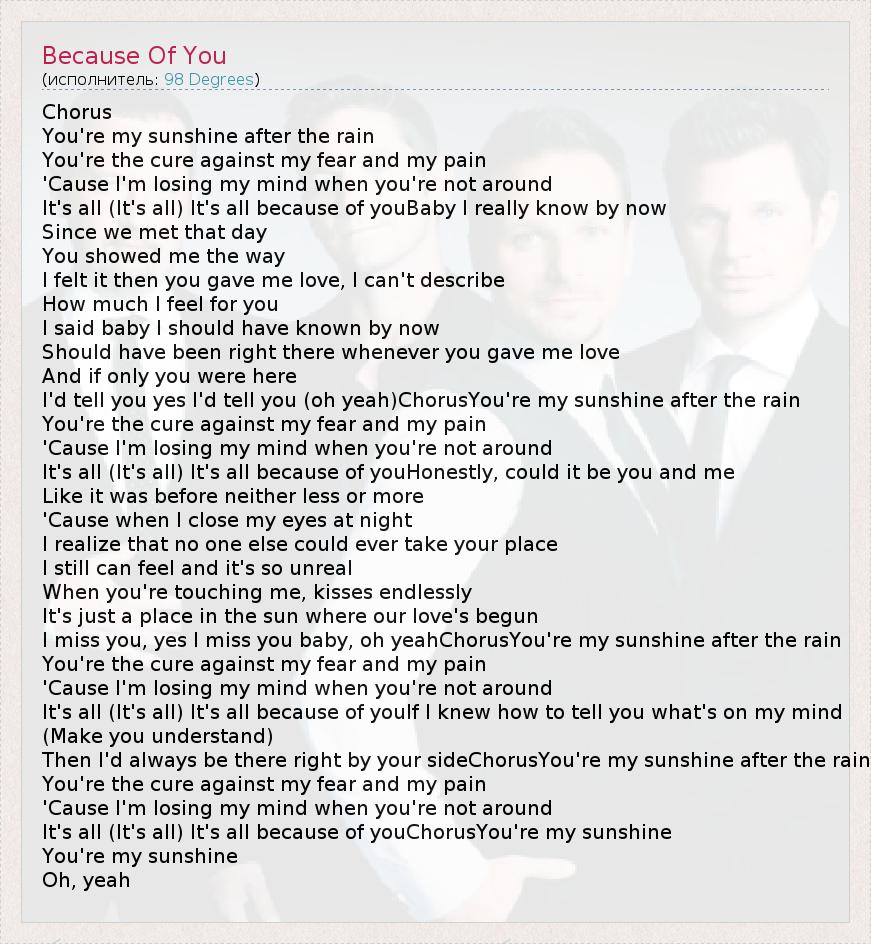 It's all (It's all) It's all because of youChorusYou're my sunshine