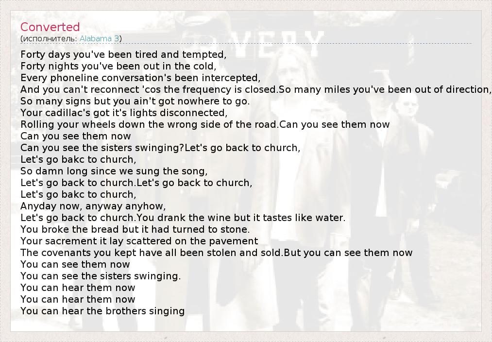 Forty days you've been tired and tempted, Forty nights you've been out in the cold, Every phoneline conversation's been intercepted, And you can't reconnect 'cos the frequency is closed.So many miles you've been out of direction, So many signs but you ain't got nowhere to go. Your cadillac's got it's lights disconnected, Rolling your wheels down the wrong side of the road.Can you see them now Can you see them now Can you see the sisters swinging?Let's go back to church, Let's go bakc to church, So damn long since we sung the song, Let's go back to church.Let's go back to church, Let's go bakc to church, Anyday now, anyway anyhow, Let's go back to church.You drank the wine but it tastes like water. You broke the bread but it had turned to stone. Your sacrement it lay scattered on the pavement The covenants you kept have all been stolen and sold.But you can see them now You can see them now You can see the sisters swinging. You can hear them now You can hear them now You can hear the brothers singing
