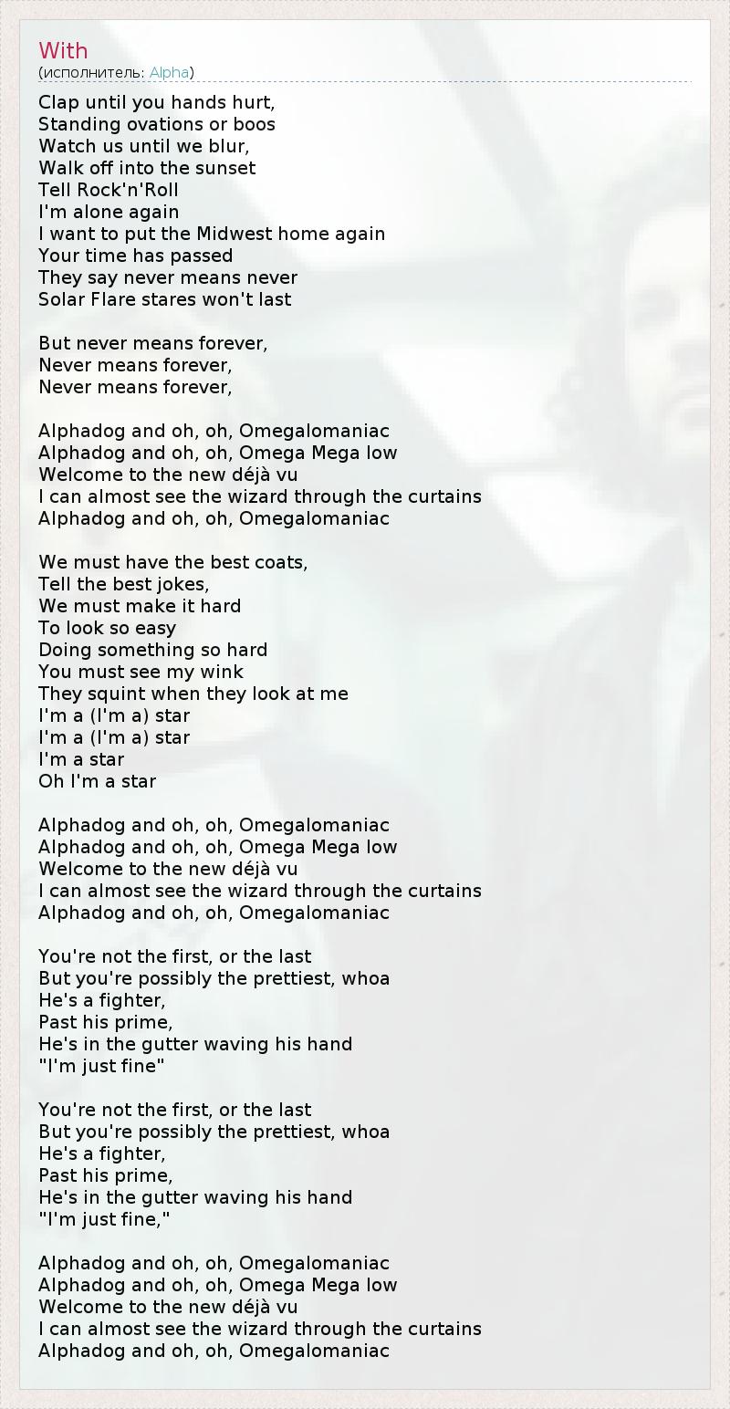 Clap until you hands hurt, Standing ovations or boos Watch us until we blur, Walk off into the sunset Tell Rock'n'Roll I'm alone again I want to put the Midwest home again Your time has passed They say never means never Solar Flare stares won't last But never means forever, Never means forever, Never means forever, Alphadog and oh, oh, Omegalomaniac Alphadog and oh, oh, Omega Mega low Welcome to the new déjà vu I can almost see the wizard through the curtains Alphadog and oh, oh, Omegalomaniac We must have the best coats, Tell the best jokes, We must make it hard To look so easy Doing something so hard You must see my wink They squint when they look at me I'm a (I'm a) star I'm a (I'm a) star I'm a star Oh I'm a star Alphadog and oh, oh, Omegalomaniac Alphadog and oh, oh, Omega Mega low Welcome to the new déjà vu I can almost see the wizard through the curtains Alphadog and oh, oh, Omegalomaniac You're not the first, or the last But you're possibly the prettiest, whoa He's a fighter, Past his prime, He's in the gutter waving his hand "I'm just fine" You're not the first, or the last But you're possibly the prettiest, whoa He's a fighter, Past his prime, He's in the gutter waving his hand "I'm just fine," Alphadog and oh, oh, Omegalomaniac Alphadog and oh, oh, Omega Mega low Welcome to the new déjà vu I can almost see the wizard through the curtains Alphadog and oh, oh, Omegalomaniac