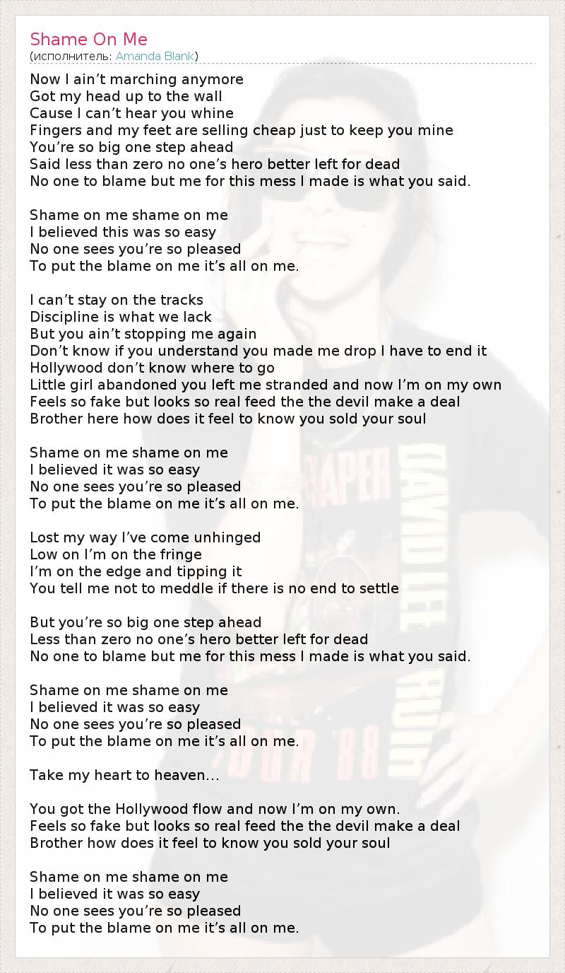 Теперь я никуда не пойду Ударилась головой об стену Потому что я не могу слышать твое хныканье Продам дешево пальцы и ноги, только чтобы ты был со мной Ты сделал такой большой шаг вперед Сказал, что тот, кто меньше нуля, не будет больше героя, оставленного умирать Никто не виноват, кроме меня, за тот беспорядок, который я сделала, как ты сказал Мне стыдно, мне стыдно Я верила, что это легкий путь Никто не видит, что ты так рад Чтобы свалить вину на меня, это все на мне Я не могу остаться на рельсах, Нам не хватает дисциплины Но ты не остановил меня снова Не знаю, если ты понимаешь, ты заставишь меня отказаться от того, что должна закончить Голливуд, не знаю, куда идти Маленькая девочка оставлена тобой на мели, и сейчас я сама по себе Чувствую фальшь, но это выглядит таким реальным, дьявол заключил сделку Брат, вот каково знать, что ты продал свою душу Мне стыдно, мне стыдно Я верила, что это легкий путь Никто не видит, что ты так рад Чтобы свалить вину на меня, это все на мне Потеряла путь, стала помешанной Стою у самого края Я на грани, оттолкнула ее Ты говоришь мне не вмешиваться, если нет конца регулирования Но ты сделал такой большой шаг вперед Тот, кто меньше нуля, не может быть лучше героя, оставленного умирать Никто не виноват, кроме меня, за тот беспорядок, который я сделала, как ты сказал Мне стыдно, мне стыдно Я верила, что это легкий путь Никто не видит, что ты так рад Чтобы свалить вину на меня, это все на мне Забери мое сердце к небесам... Ты в Голливуде и сейчас я сама по себе Чувствую фальшь, но это выглядит таким реальным, дьявол заключил сделку Брат, вот каково знать, что ты продал свою душу Мне стыдно, мне стыдно Я верила, что это легкий путь Никто не видит, что ты так рад Чтобы свалить вину на меня, это все на мне