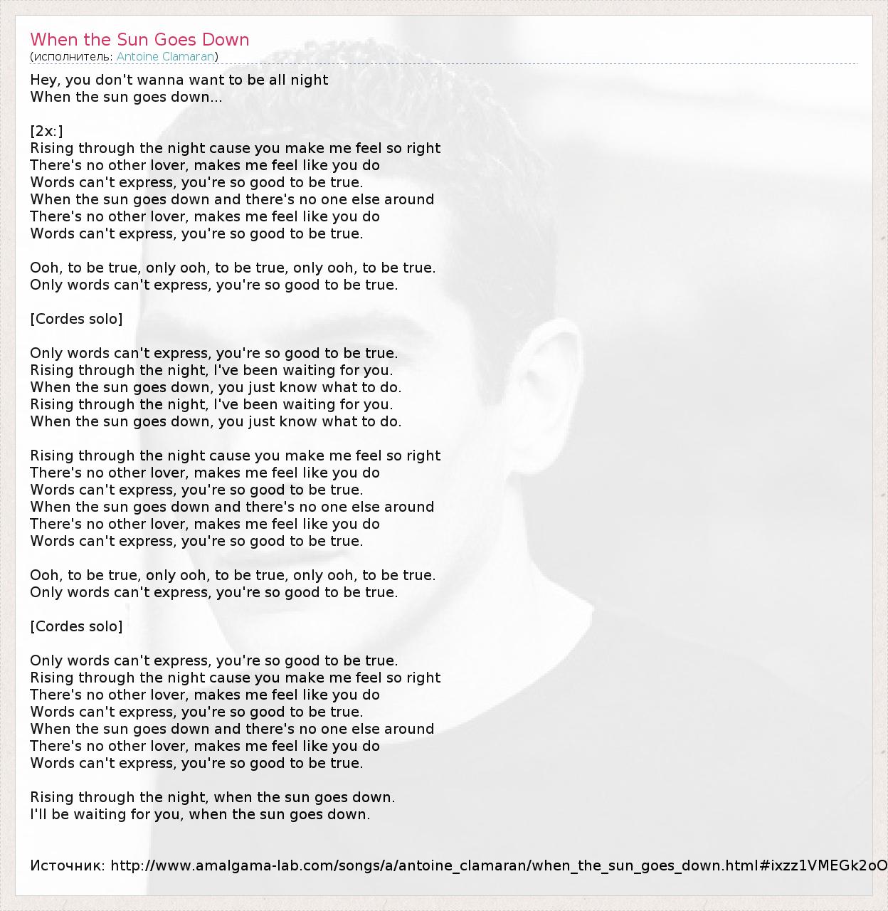 Источник: http://www.amalgama-lab.com/songs/a/antoine_clamaran/when_the_sun_goes_down.html#ixzz1VMEJejGw