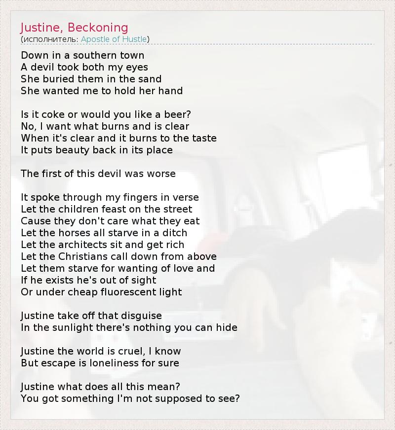 А как ты думаешь, о чем песня "Justine, Beckoning" ?