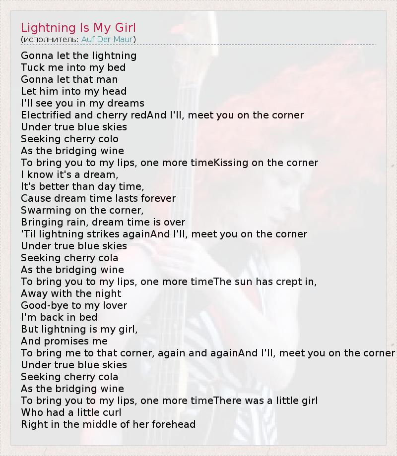 Gonna let the lightning Tuck me into my bed Gonna let that man Let him into my head I'll see you in my dreams Electrified and cherry redAnd I'll, meet you on the corner Under true blue skies Seeking cherry colo As the bridging wine To bring you to my lips, one more timeKissing on the corner I know it's a dream, It's better than day time, Cause dream time lasts forever Swarming on the corner, Bringing rain, dream time is over 'Til lightning strikes againAnd I'll, meet you on the corner Under true blue skies Seeking cherry cola As the bridging wine To bring you to my lips, one more timeThe sun has crept in, Away with the night Good-bye to my lover I'm back in bed But lightning is my girl, And promises me To bring me to that corner, again and againAnd I'll, meet you on the corner Under true blue skies Seeking cherry cola As the bridging wine To bring you to my lips, one more timeThere was a little girl Who had a little curl Right in the middle of her forehead