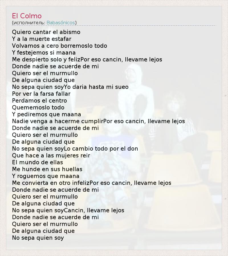 Quiero cantar el abismo Y a la muerte estafar Volvamos a cero borremoslo todo Y festejemos si maana Me despierto solo y felizPor eso cancin, llevame lejos Donde nadie se acuerde de mi Quiero ser el murmullo De alguna ciudad que No sepa quien soyYo daria hasta mi sueo Por ver la farsa fallar Perdamos el centro Quememoslo todo Y pediremos que maana Nadie venga a hacerme cumplirPor eso cancin, llevame lejos Donde nadie se acuerde de mi Quiero ser el murmullo De alguna ciudad que No sepa quien soyLo cambio todo por el don Que hace a las mujeres reir El mundo de ellas Me hunde en sus huellas Y roguemos que maana Me convierta en otro infelizPor eso cancin, llevame lejos Donde nadie se acuerde de mi Quiero ser el murmullo De alguna ciudad que No sepa quien soyCancin, llevame lejos Donde nadie se acuerde de mi Quiero ser el murmullo De alguna ciudad que No sepa quien soy