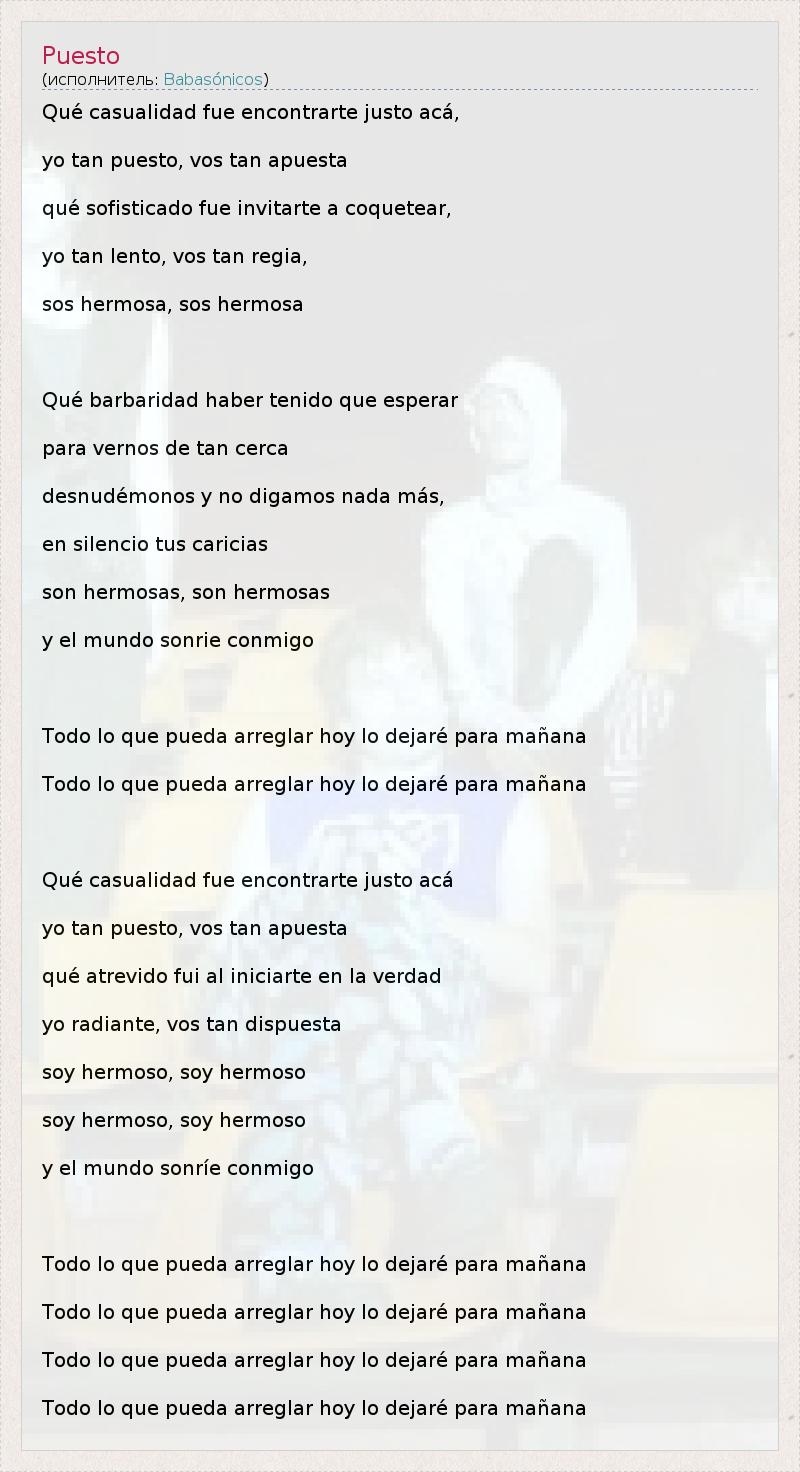 Это интересно:Babasónicos - аргентинская рок-группа, образованная в начале 1990-ых. Cтала одной из основных андерграунд-команд конца 90-ых.Название является синтезом от "Sai Baba" (индийский гуру) и от "The Jetsons" (по-испански - "Los Supersónicos").Лид-вокалист Adrián "Dárgelos" Rodríguez и клавишник Diego "Uma-T" Tuñón изначально решили играть в стиле "новой волны" (так называемый new wave), совершенно... продолжение