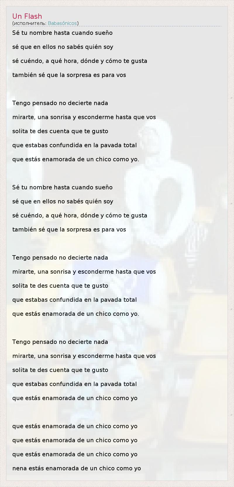 Sé tu nombre hasta cuando sueño sé que en ellos no sabés quién soy sé cuéndo, a qué hora, dónde y cómo te gusta también sé que la sorpresa es para vos Tengo pensado no decierte nada mirarte, una sonrisa y esconderme hasta que vos solita te des cuenta que te gusto que estabas confundida en la pavada total que estás enamorada de un chico como yo. Sé tu nombre hasta cuando sueño sé que en ellos no sabés quién soy sé cuéndo, a qué hora, dónde y cómo te gusta también sé que la sorpresa es para vos Tengo pensado no decierte nada mirarte, una sonrisa y esconderme hasta que vos solita te des cuenta que te gusto que estabas confundida en la pavada total que estás enamorada de un chico como yo. Tengo pensado no decierte nada mirarte, una sonrisa y esconderme hasta que vos solita te des cuenta que te gusto que estabas confundida en la pavada total que estás enamorada de un chico como yo que estás enamorada de un chico como yo que estás enamorada de un chico como yo que estás enamorada de un chico como yo nena estás enamorada de un chico como yo