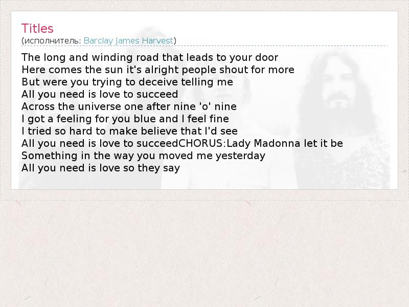 All you need is love to succeedCHORUS:Lady Madonna let it be