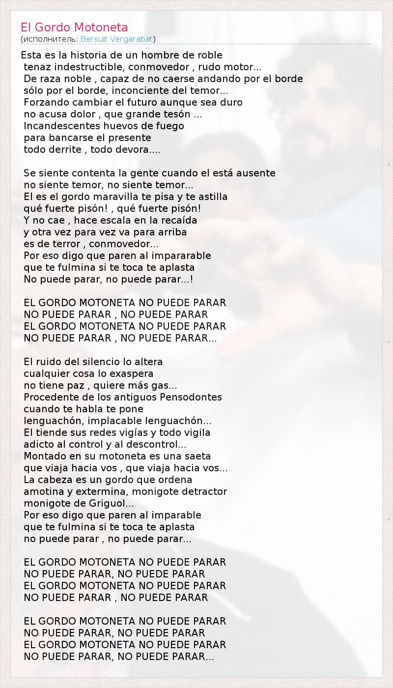 Esta es la historia de un hombre de roble tenaz indestructible, conmovedor , rudo motor... De raza noble , capaz de no caerse andando por el borde sólo por el borde, inconciente del temor... Forzando cambiar el futuro aunque sea duro no acusa dolor , que grande tesón ... Incandescentes huevos de fuego para bancarse el presente todo derrite , todo devora.... Se siente contenta la gente cuando el está ausente no siente temor, no siente temor... El es el gordo maravilla te pisa y te astilla qué fuerte pisón! , qué fuerte pisón! Y no cae , hace escala en la recaída y otra vez para vez va para arriba es de terror , conmovedor... Por eso digo que paren al impararable que te fulmina si te toca te aplasta No puede parar, no puede parar...! EL GORDO MOTONETA NO PUEDE PARAR NO PUEDE PARAR , NO PUEDE PARAR EL GORDO MOTONETA NO PUEDE PARAR NO PUEDE PARAR , NO PUEDE PARAR... El ruido del silencio lo altera cualquier cosa lo exaspera no tiene paz , quiere más gas... Procedente de los antiguos Pensodontes cuando te habla te pone lenguachón, implacable lenguachón... El tiende sus redes vigías y todo vigila adicto al control y al descontrol... Montado en su motoneta es una saeta que viaja hacia vos , que viaja hacia vos... La cabeza es un gordo que ordena amotina y extermina, monigote detractor monigote de Griguol... Por eso digo que paren al imparable que te fulmina si te toca te aplasta no puede parar , no puede parar... EL GORDO MOTONETA NO PUEDE PARAR NO PUEDE PARAR, NO PUEDE PARAR EL GORDO MOTONETA NO PUEDE PARAR NO PUEDE PARAR , NO PUEDE PARAR EL GORDO MOTONETA NO PUEDE PARAR NO PUEDE PARAR, NO PUEDE PARAR EL GORDO MOTONETA NO PUEDE PARAR NO PUEDE PARAR, NO PUEDE PARAR...