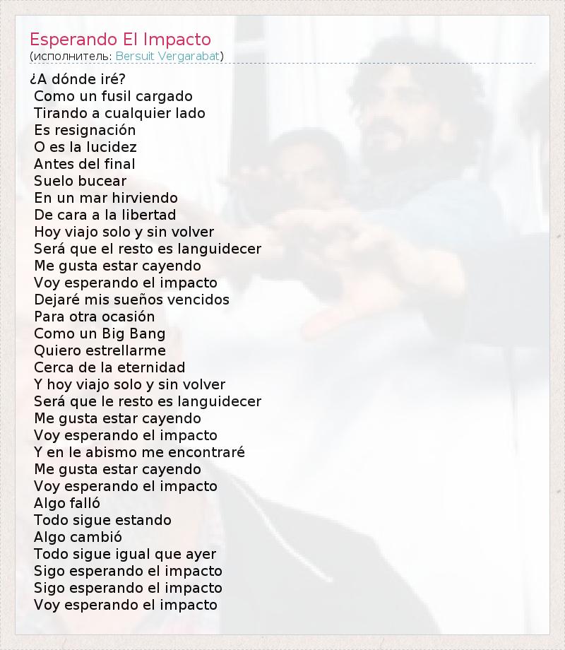 ¿Dónde IRE ? Комо ООН фузея cargado Tirando в cualquier Ладо Es resignación О эс ла lucidez Анты -дель- финал Suelo bucear En ООН мар hirviendo Де КараLa Libertad Хой Viajo соло у грех Volver Sera Que эль Resto -эс languidecer Me Gusta ЭСТАР cayendo Вой Esperando эль Impacto Dejaré неправильно sueños vencidos Пара Otra OCASION Комо ООН Big Bang Quiero estrellarme Cerca -де-ла eternidad У хой Viajo соло у грех Volver Sera дие Le Resto эс languidecer Me Gusta ЭСТАР cayendo Вой Esperando эль Impacto У ан ле Abismo меня encontraré Me Gusta ЭСТАР cayendo Вой Esperando эль Impacto Algo Fallo Todo Sigue estando Algo Камбио Todo Sigue Igual дие Айер Sigo Esperando эль Impacto Sigo Esperando эль Impacto Вой Esperando эль Impacto